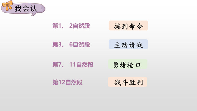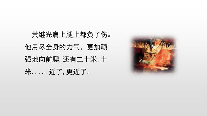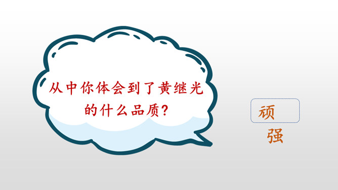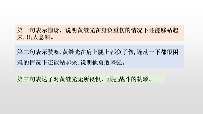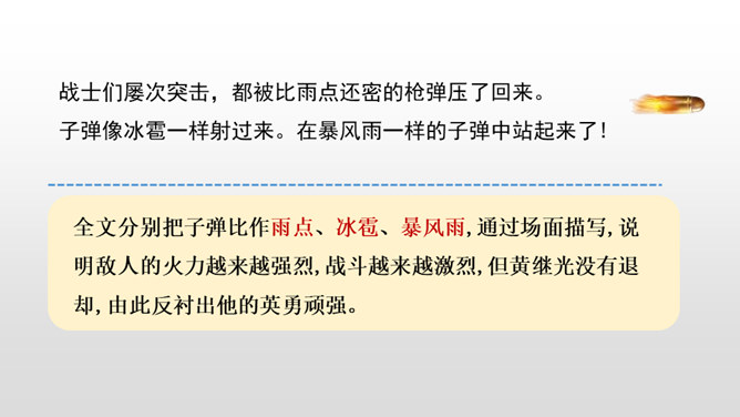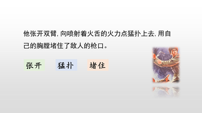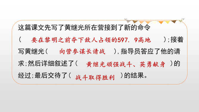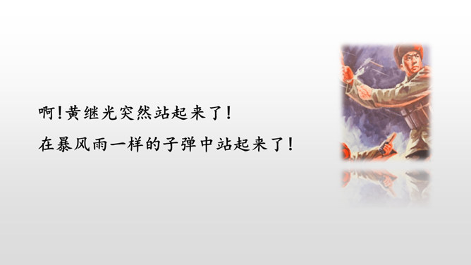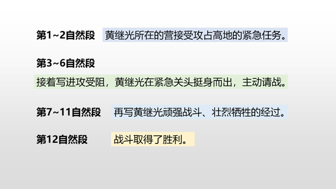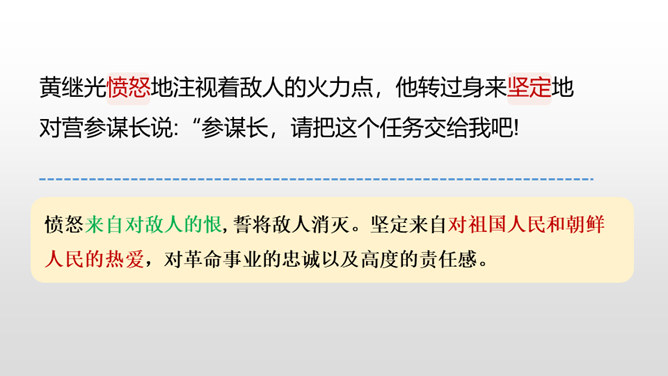 第1~2自然段,黄继光所在的营接受攻占高地的紧急任务。第3~6自然段,接着写进攻受阻,黄继光在紧急关头挺身而出,主动请战。第7~11自然段,再写黄继光顽强战斗、壮烈牺牲的经过。第12自然段,战斗取得了胜利。愤怒来自对敌人的恨,誓将敌人消灭。坚定来自对祖国人民和朝鲜人民的热爱,对革命事业的忠诚以及高度的责任感。第一句表示惊讶,说明黄继光在身负重伤的情况下还能够站起来,出人意料。所属专题:黄继光ppt。