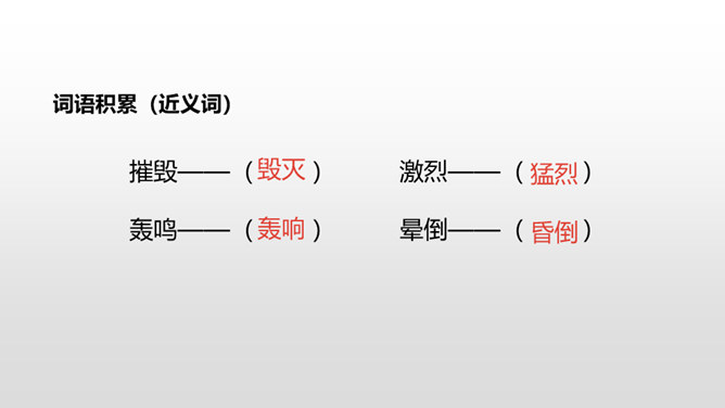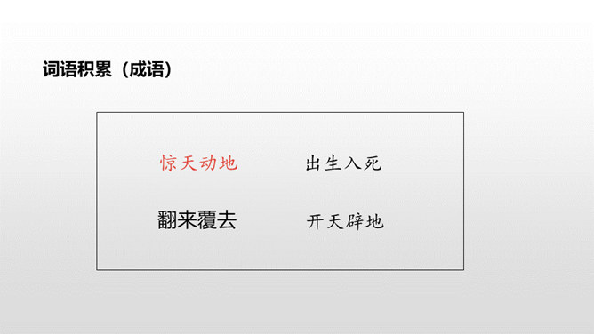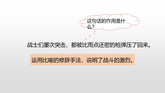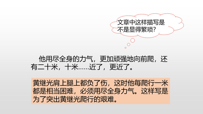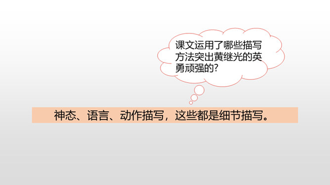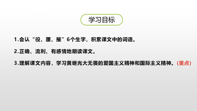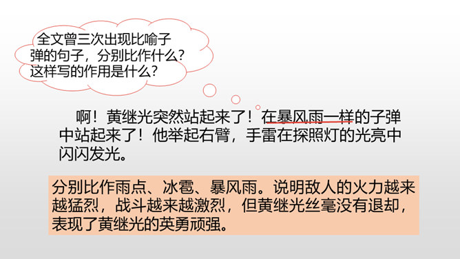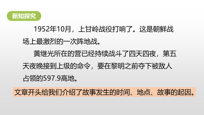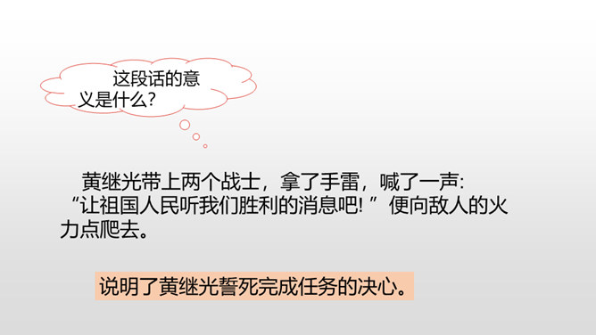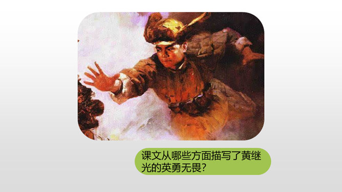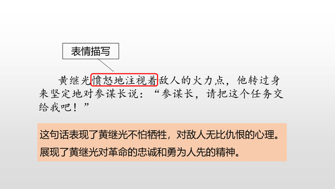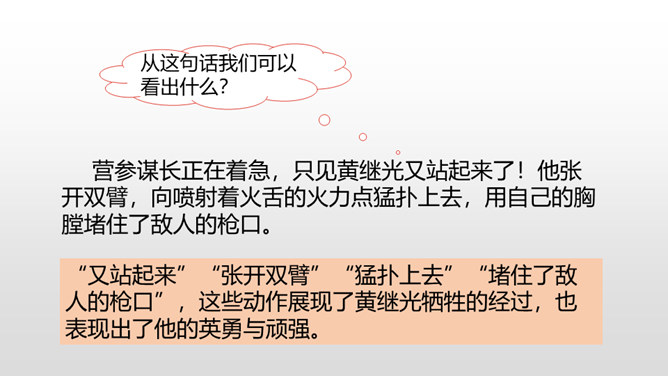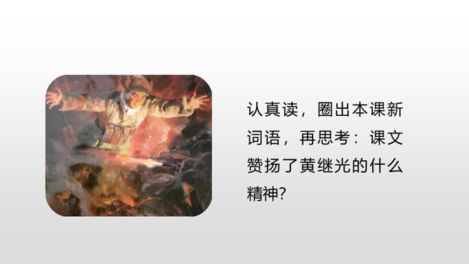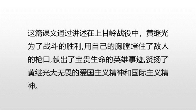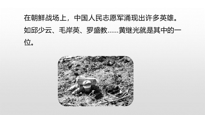 课文从哪些方面描写了黄继光的英勇无畏?在朝鲜战场上,中国人民志愿军涌现出许多英雄。如邱少云、毛岸英、罗盛教……黄继光就是其中的一位。认真读,圈出本课新词语,再思考:课文赞扬了黄继光的什么精神?文章开头给我们介绍了故事发生的时间、地点、故事的起因。运用比喻的修辞手法,说明了战斗的激烈。这句话表现了黄继光不怕牺牲,对敌人无比仇恨的心理。展现了黄继光对革命的忠诚和勇为人先的精神。所属专题:黄继光ppt。