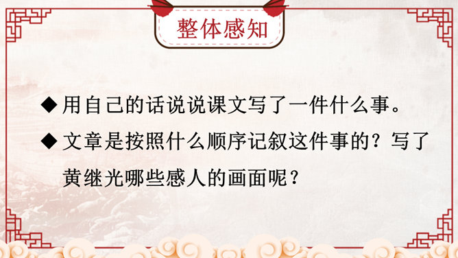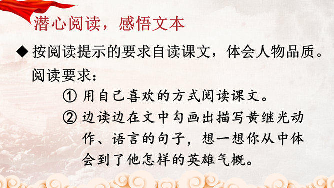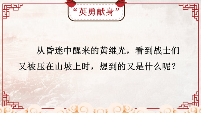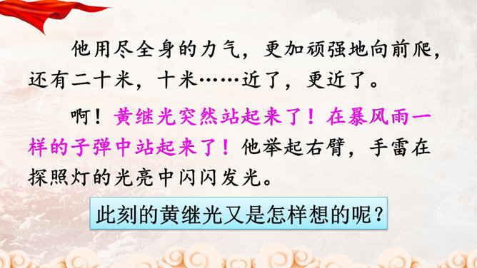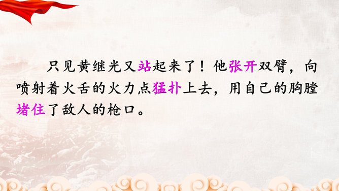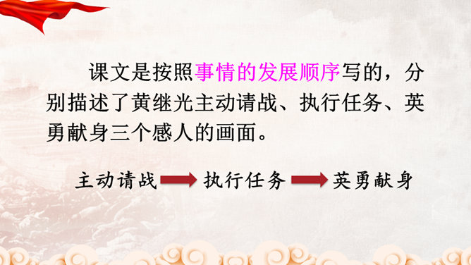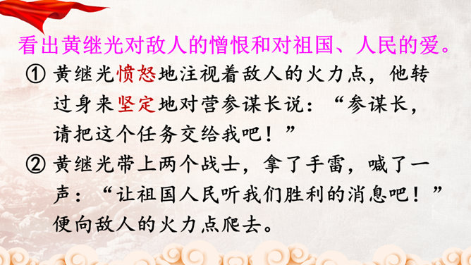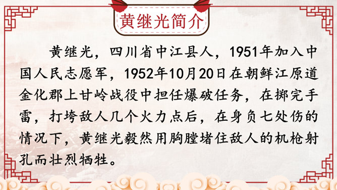 同学们,正是有了许许多多像黄继光这样为了祖国和人民的利益勇于献身的英雄,我们的祖国才会日益强大,这种精神不仅仅表现在战场上,也存在于科学界。那些热爱祖国、积极投身祖国科研事业的科学家们,同样具有崇高的精神品质!黄继光用生命铺就了一条胜利之路,战友们冲上阵地后发现,黄继光伟岸的身躯仍然压在敌人的射击孔上,他的手仍然牢牢地抓着周围的麻袋,腿已被打断,身后是一道十多米长的血印。所属专题:黄继光ppt。