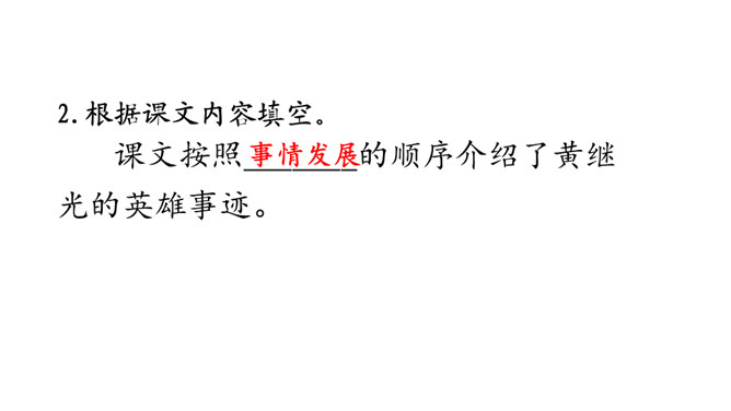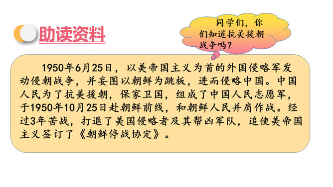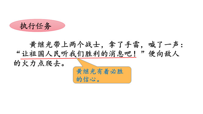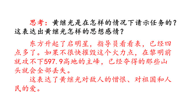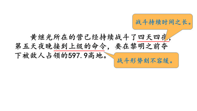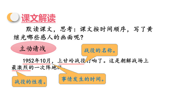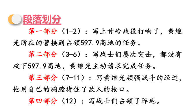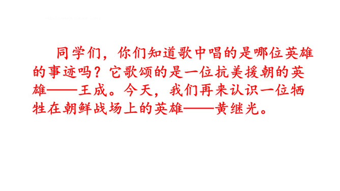 同学们,你们知道歌中唱的是哪位英雄的事迹吗?它歌颂的是一位抗美援朝的英雄——王成。今天,我们再来认识一位牺牲在朝鲜战场上的英雄——黄继光。课文写了黄继光在上甘岭战役中,为了战斗的胜利,用胸膛堵住敌人的枪口而壮烈牺牲的事。第一部分(1-2):写上甘岭战役打响了,黄继光所在的营接到占领597.9高地的任务。第二部分(3-6):写战士们屡次突击,都没有攻下597.9高地,黄继光主动请求完成任务。所属专题:黄继光ppt。