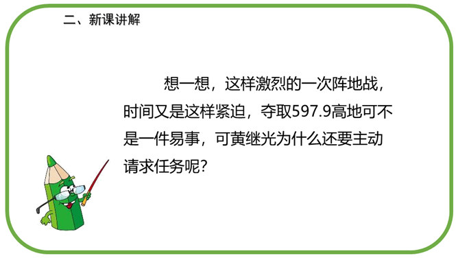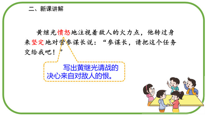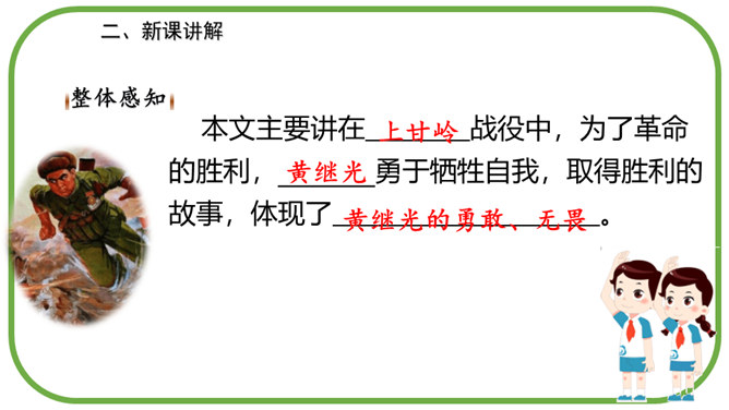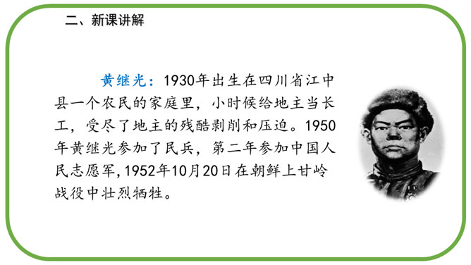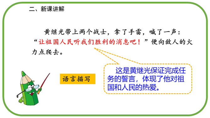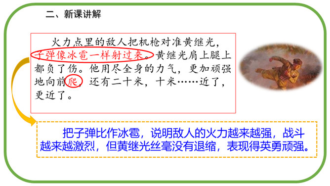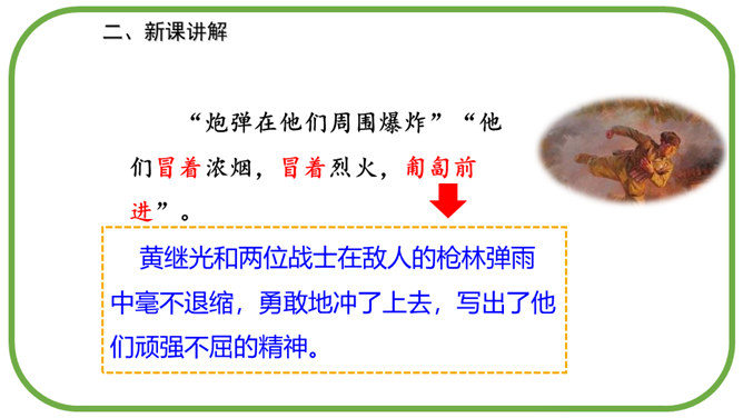 黄继光和两位战士在敌人的枪林弹雨中毫不退缩,勇敢地冲了上去,写出了他们顽强不屈的精神。把子弹比作冰雹,说明敌人的火力越来越强,战斗越来越激烈,但黄继光丝毫没有退缩,表现得英勇顽强。表现了黄继光宁愿牺牲自己,也要完成任务的大无畏英雄气概。体现了他对敌人的仇恨和他同敌人拼到底的决心。尤其第二次站起来,说明黄继光已经决定献出自己年轻的生命。所属专题:黄继光ppt。