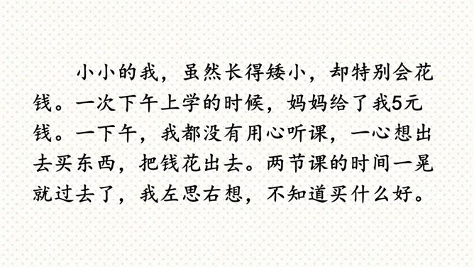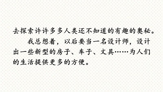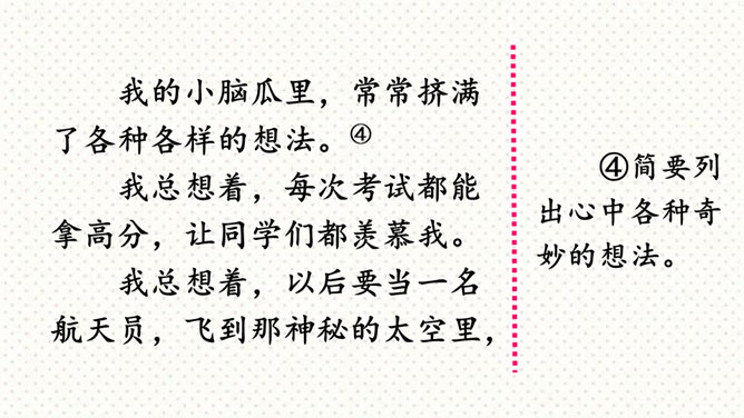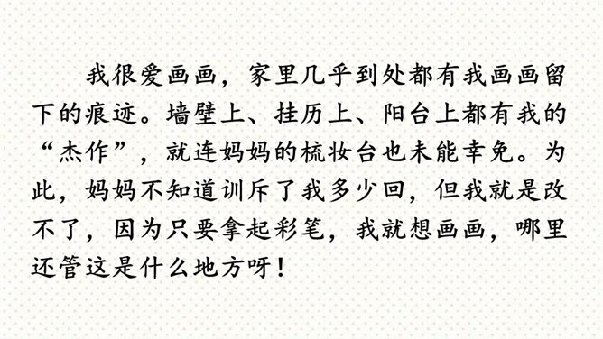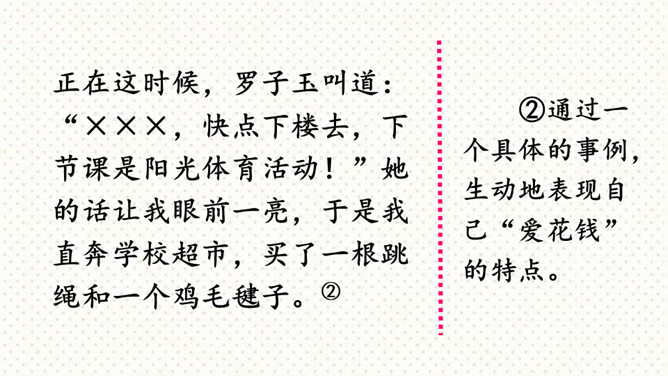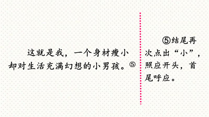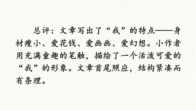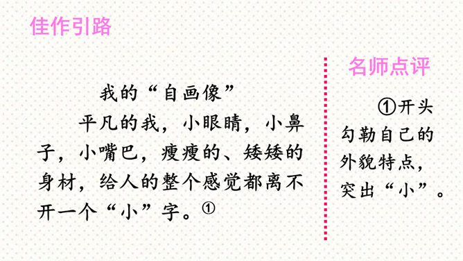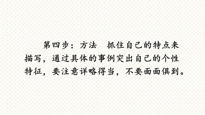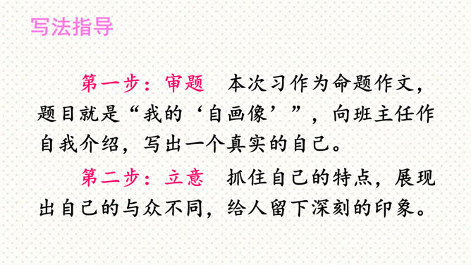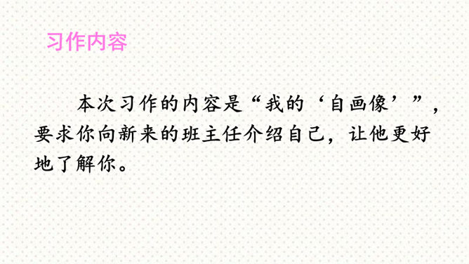 本次习作的内容是“我的‘自画像’”,要求你向新来的班主任介绍自己,让他更好地了解你。第一步:审题 本次习作为命题作文,题目就是“我的‘自画像’”,向班主任作自我介绍,写出一个真实的自己。第二步:立意 抓住自己的特点,展现出自己的与众不同,给人留下深刻的印象。第四步:方法 抓住自己的特点来描写,通过具体的事例突出自己的个性特征,要注意详略得当,不要面面俱到。所属专题:我的自画像ppt。