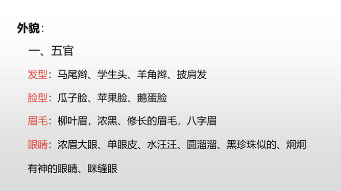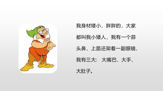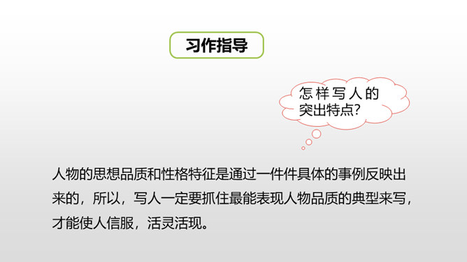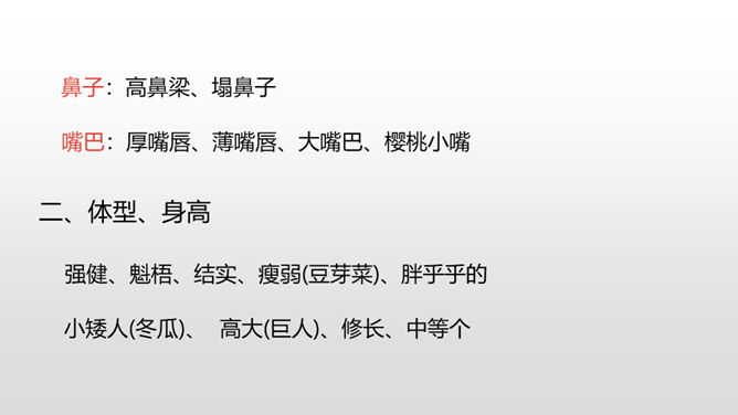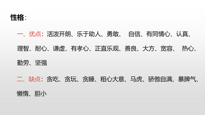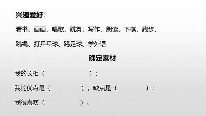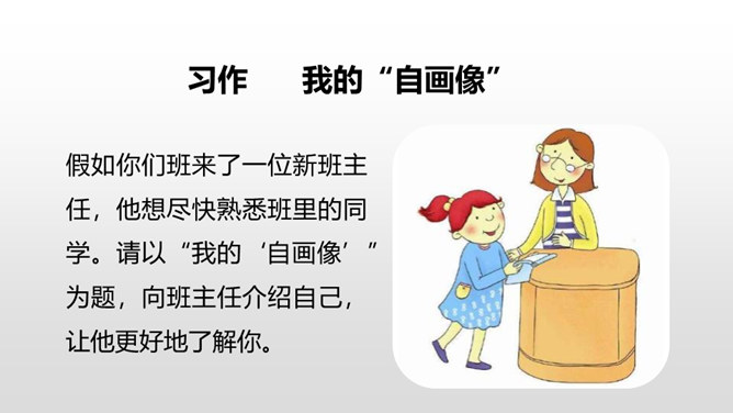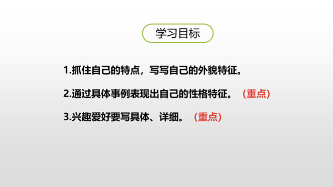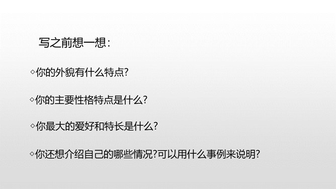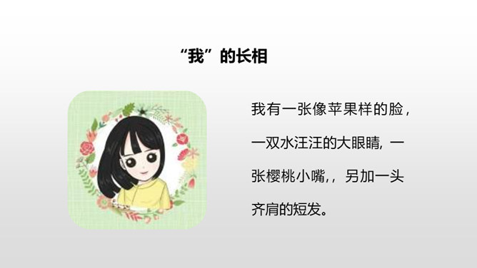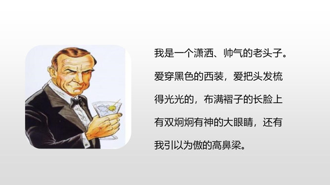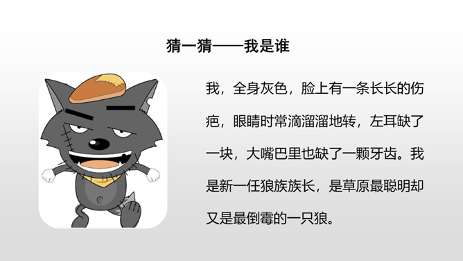 1.抓住自己的特点,写写自己的外貌特征。2.通过具体事例表现出自己的性格特征。(重点)3.兴趣爱好要写具体、详细。(重点)人物的思想品质和性格特征是通过一件件具体的事例反映出来的,所以,写人一定要抓住最能表现人物品质的典型来写,才能使人信服,活灵活现。我,全身灰色,脸上有一条长长的伤疤,眼睛时常滴溜溜地转,左耳缺了一块,大嘴巴里也缺了一颗牙齿。我是新一任狼族族长,是草原最聪明却又是最倒霉的一只狼。所属专题:我的自画像ppt。