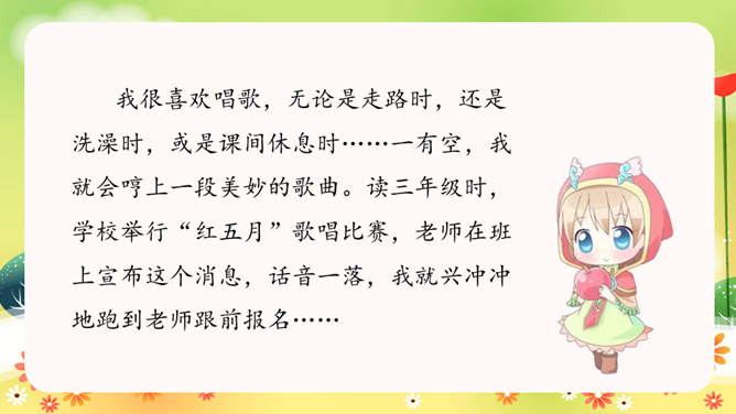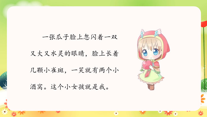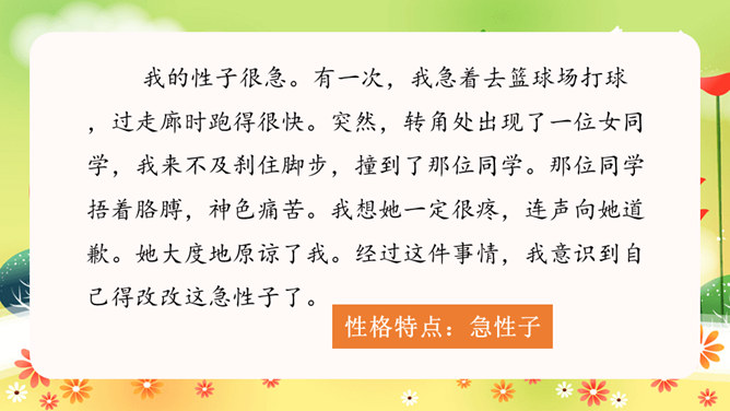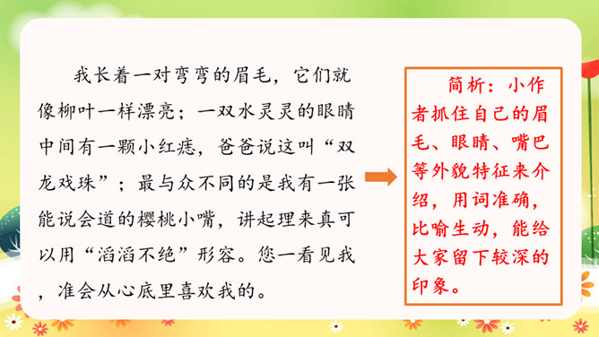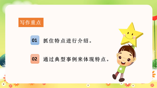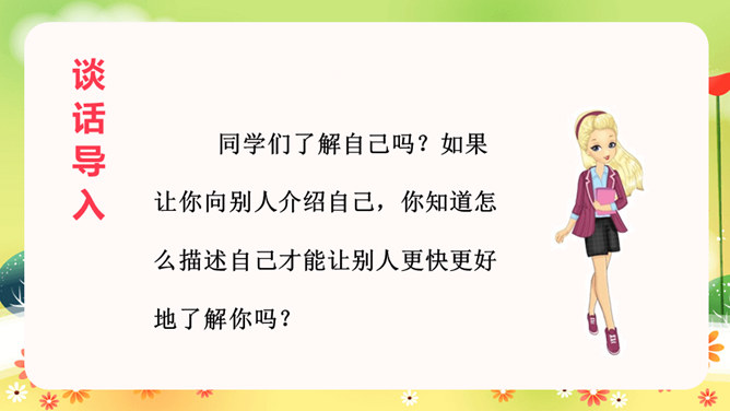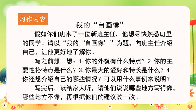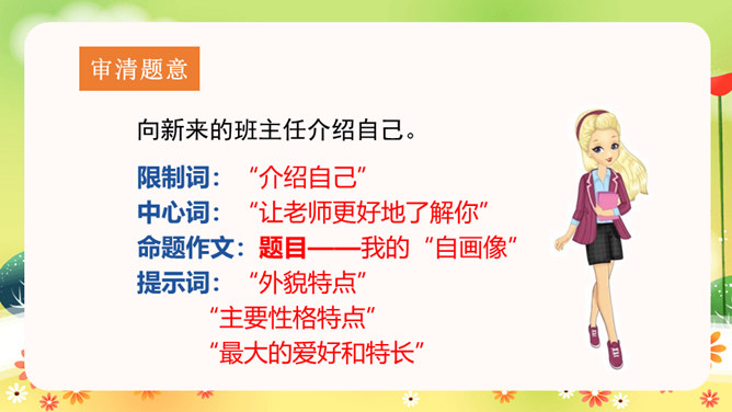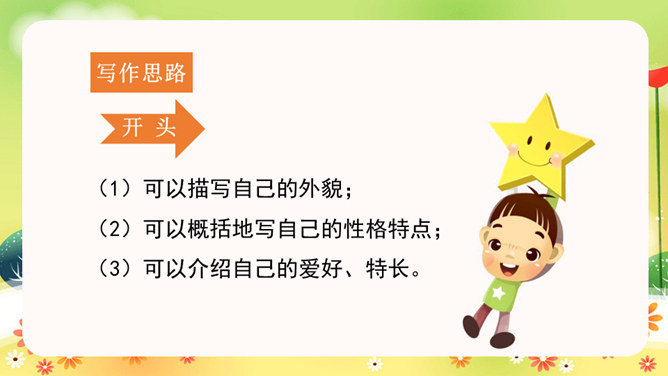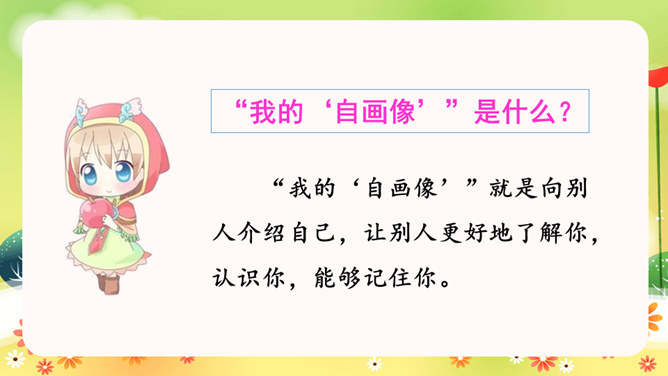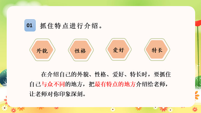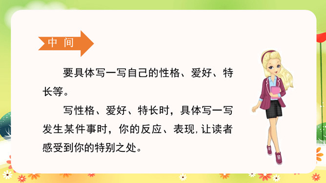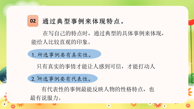 在介绍自己的外貌、性格、爱好、特长时,要抓住自己与众不同的地方,把最有特点的地方介绍给老师,让老师对你印象深刻。通过典型事例来体现特点。在写自己的特点时,通过典型的具体事例来体现,能给人比较直观的印象。1.所选事例要有真实性。只有真实的事情才能让人感到可信,才能打动人。2.所选事例要有代表性。有代表性的事例最能反映人物的性格特点,也最有说服力。所属专题:我的自画像ppt。