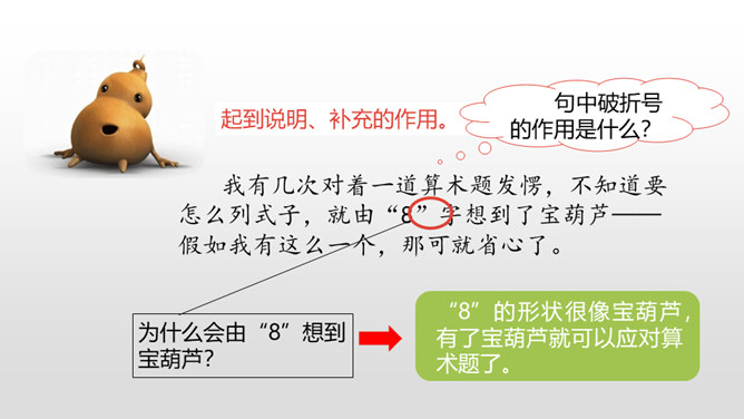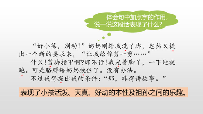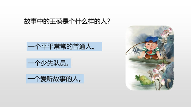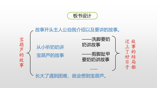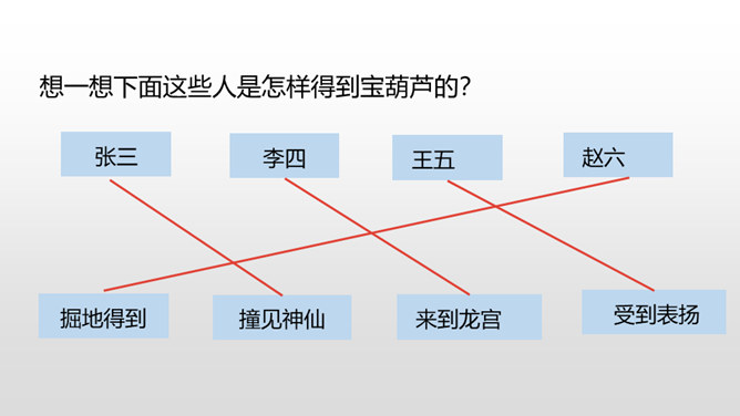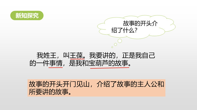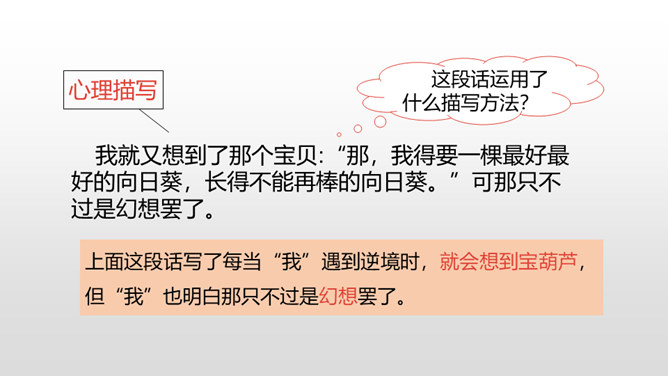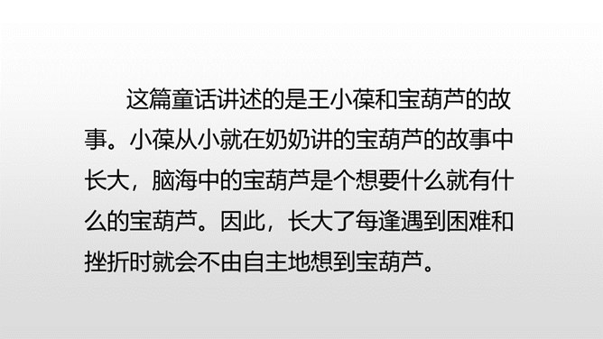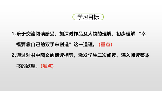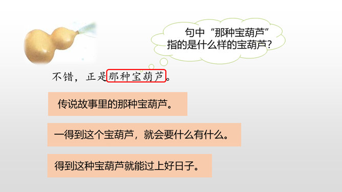 1.乐于交流阅读感受,加深对作品及人物的理解,初步理解 “幸福要靠自己的双手来创造”这一道理。 (重点)2.通过对书中图文的朗读指导,激发学生二次阅读、深入阅读整本书的欲望。(难点)通过上节课的学习,我们知道了课文中所说的宝葫芦是什么样的宝葫芦。故事的开头开门见山,介绍了故事的主人公和所要讲的故事。童话故事的结局大多都是人们对美好生活的向往,大都体现了“好人有好报”的结局。所属专题:宝葫芦的秘密ppt。