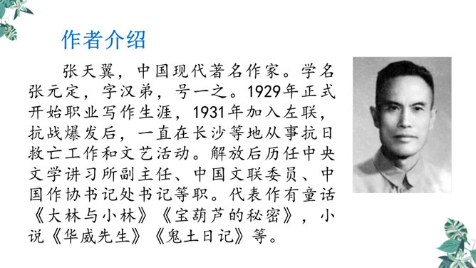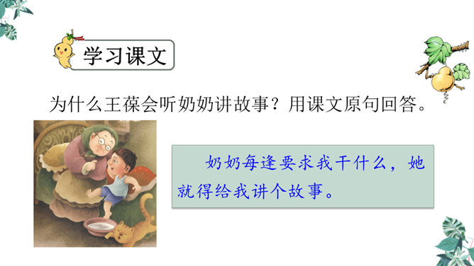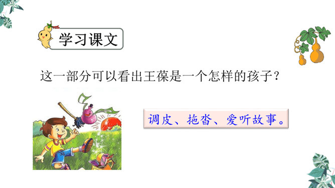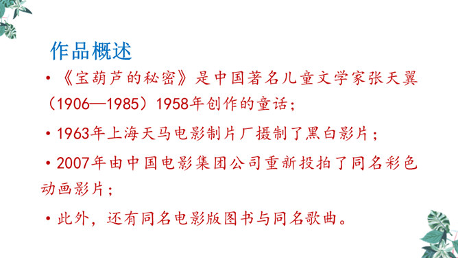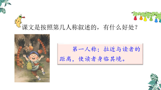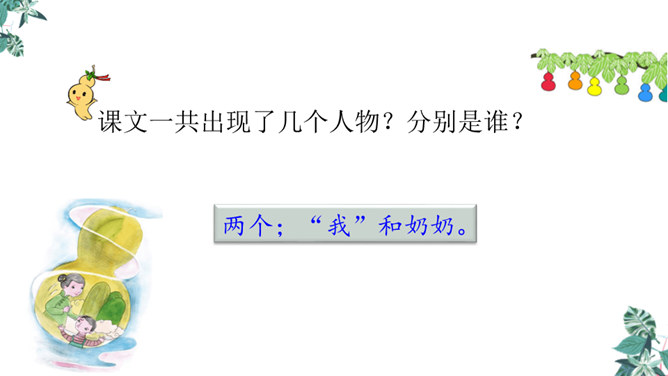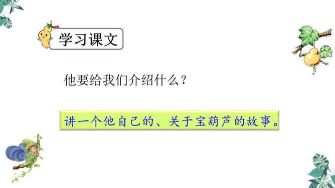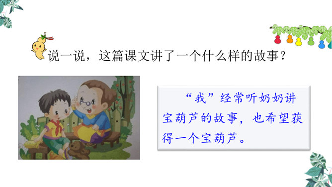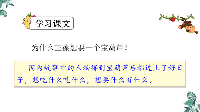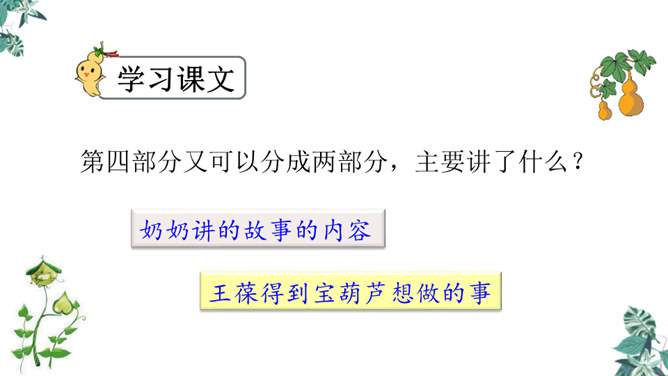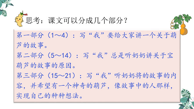 思考:课文可以分成几个部分?第一部分(1~4):写“我”要给大家讲一个关于葫芦的故事。第二部分(5~14):写“我”总是听奶奶讲关于宝葫芦的故事的原因。第三部分(15~21):写“我”听奶奶将的故事的内容,并希望有一个神奇的葫芦,像故事中的人那样,实现自己的种种想法。主人公王葆总是想着得到一个宝葫芦,但是等他真正得到后,他逐渐发现宝葫芦并不能让他过上自己梦寐以求的“好日子”。想一想,得到宝葫芦的王葆身上会发生哪些有趣的故事?所属专题:宝葫芦的秘密ppt。