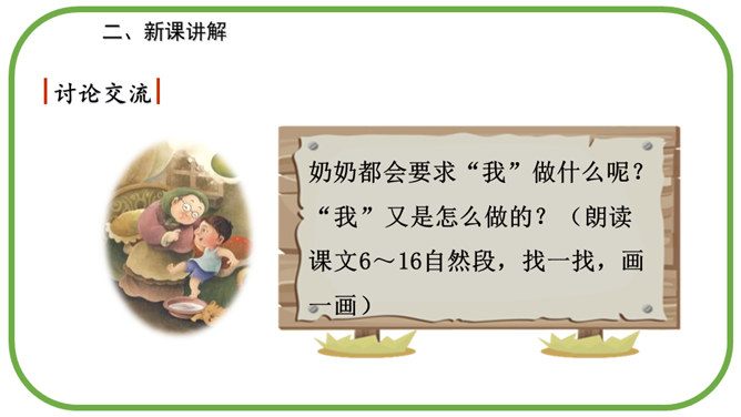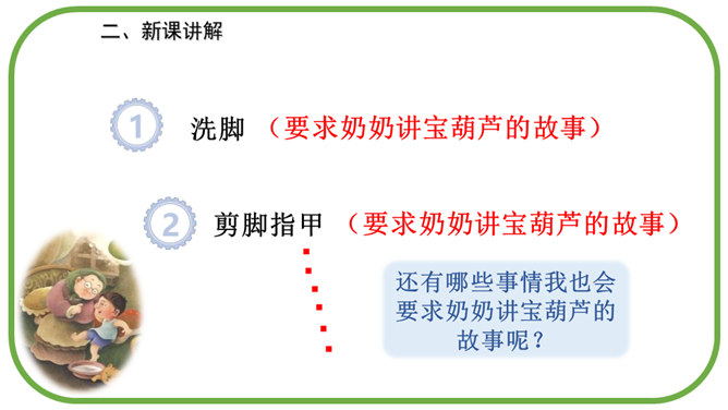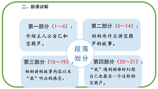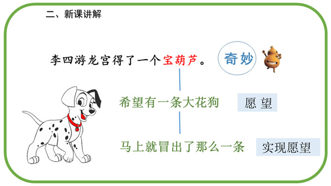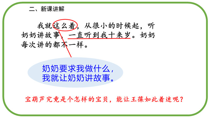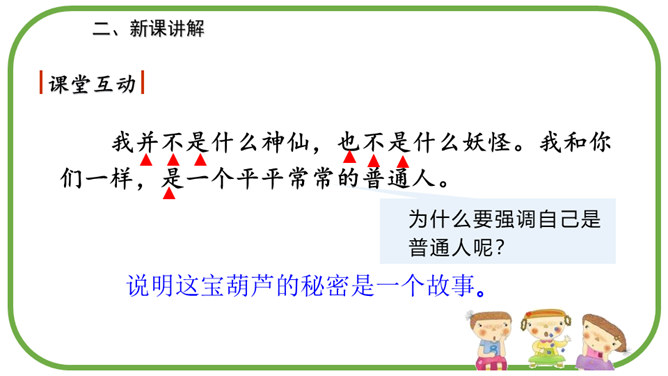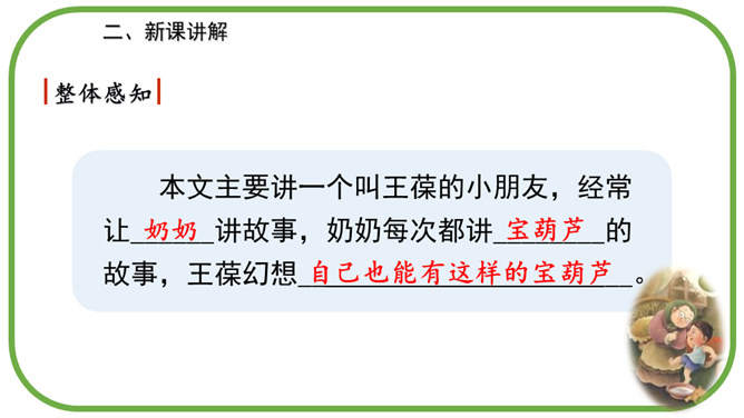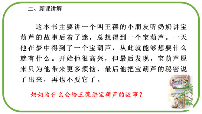 用故事交换达到奶奶的要求,充满童趣,也说明了我爱听故事。奶奶都会要求“我”做什么呢?“我”又是怎么做的?(朗读课文6~16自然段)你想拥有这样的宝葫芦吗?你会怎样得到它?又会让它帮你实现什么愿望呢?(同桌之间说一说)根据文中奶奶给王葆讲的故事,选一个,根据已有内容创编新故事。当王葆真的得到了一个宝葫芦时,他逐渐认识到靠宝葫芦不劳而获,带给他的不是幸福,而是烦恼。真正的幸福要靠自己的劳动获得!所属专题:宝葫芦的秘密ppt。