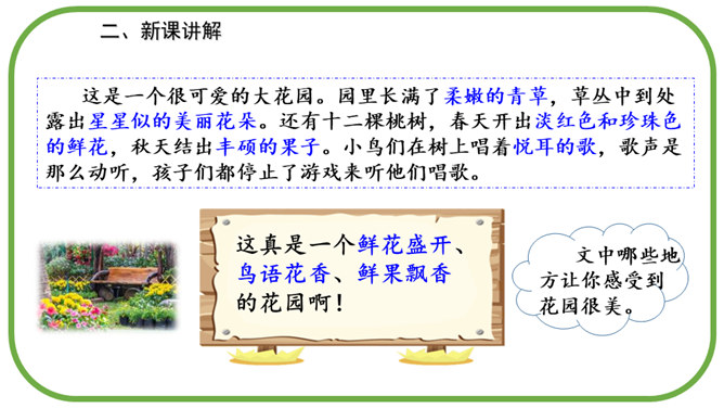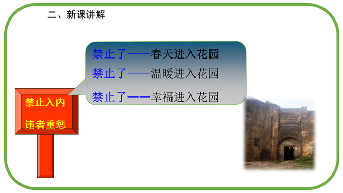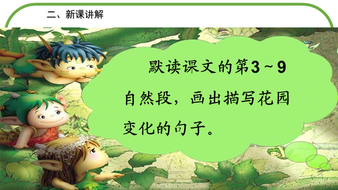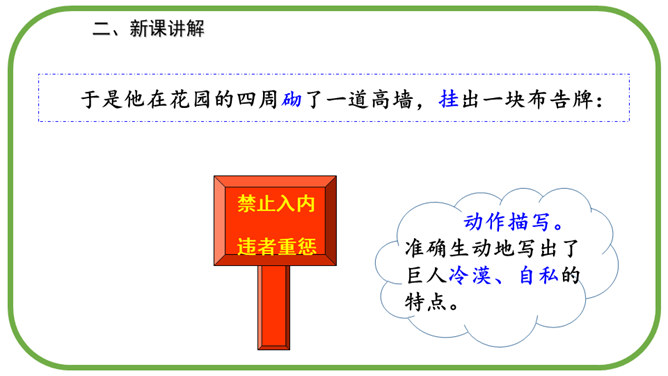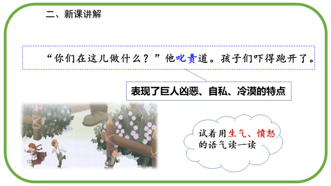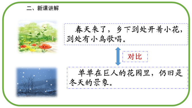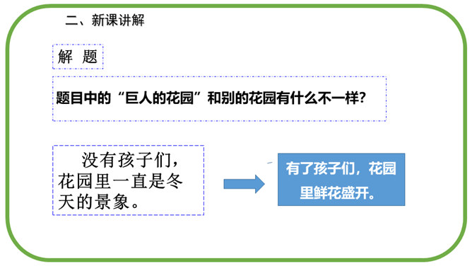 课文讲的是一个巨人看到孩子们在自已的花园里玩,很生气,就砌起高墙将孩子们拒于墙外,从此花园里只有冬天,直到一天孩子们从墙洞里爬进来,春天也就来了。后来在孩子的启发下,巨人拆了围墙,花园变成了孩子们的乐园。人们常说,每一篇童话故事都有一个极美的化身,我们需要时时刻刻去感悟美的力量。他明白了花园没有春天的原因:他太自私、任性、太冷酷,一次次赶走孩子,他想自己独自享受一切,可换来的是寂寞和寒冷。所属专题:巨人的花园ppt。