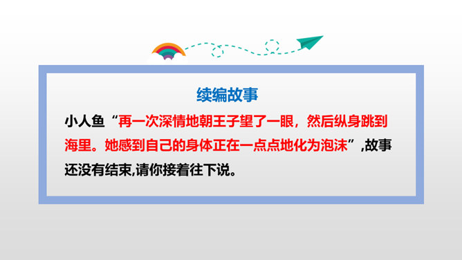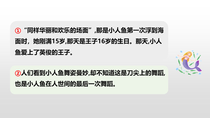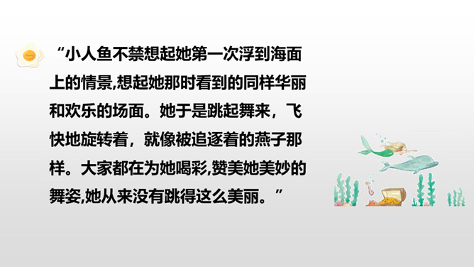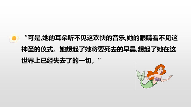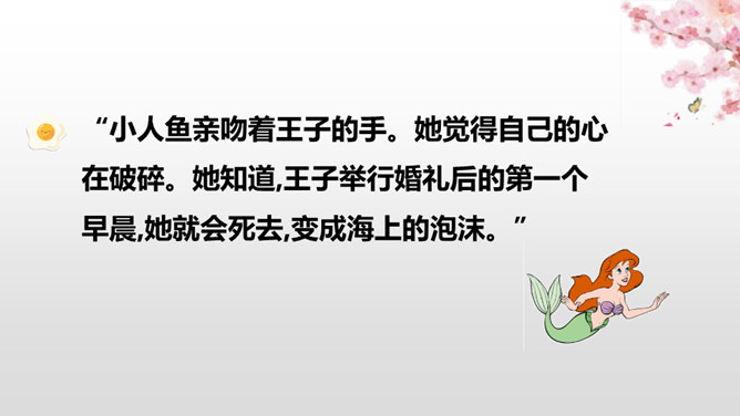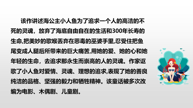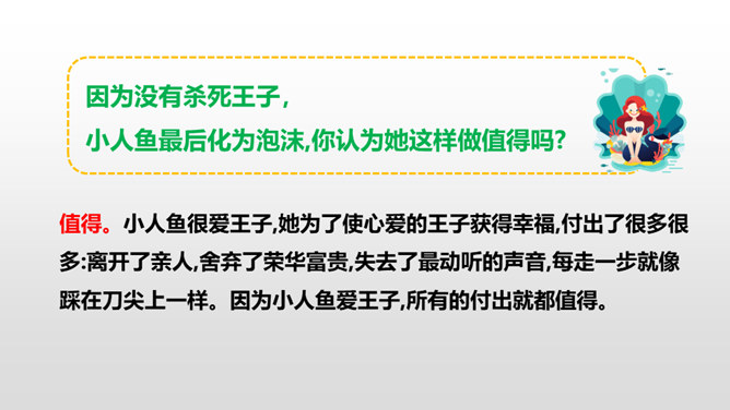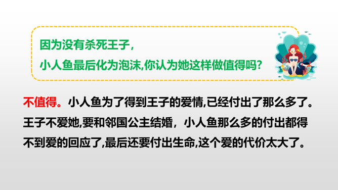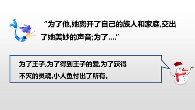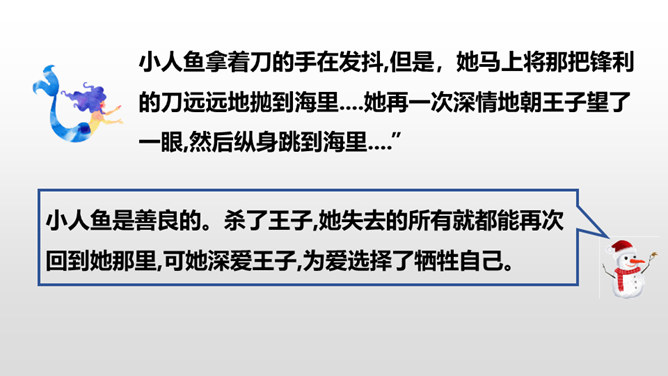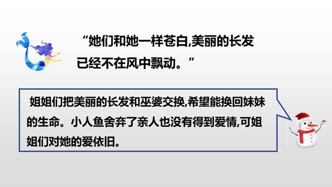 小人鱼救活了王子,为了王子放弃了家人、荣华富贵,舍弃了动人嗓音,忍受着没有止境的苦痛。她很勇敢。她做了这么多,就是为了获得王子的爱。可是王子却以为救活自己的是那位公主,王子将与公主结婚,小人鱼不但没有获得王子的爱情,还要死去,变成泡沫。姐姐们把美丽的长发和巫婆交换,希望能换回妹妹的生命。小人鱼舍弃了亲人也没有得到爱情,可姐姐们对她的爱依旧。小人鱼是善良的。杀了王子,她失去的所有就都能再次回到她那里,可她深爱王子,为爱选择了牺牲自己。所属专题:海的女儿ppt。