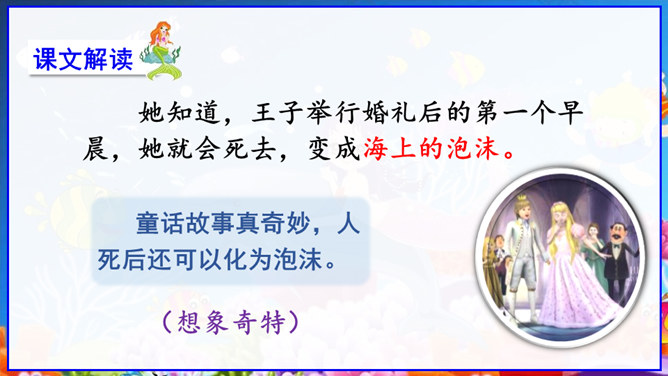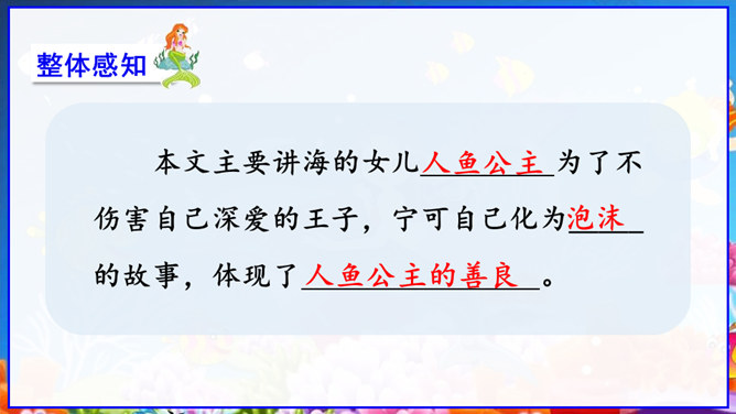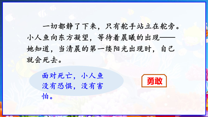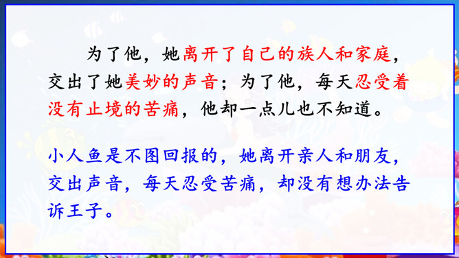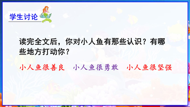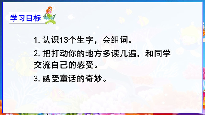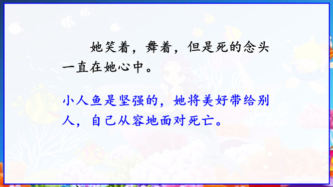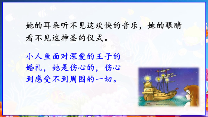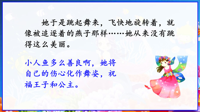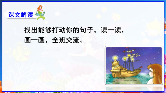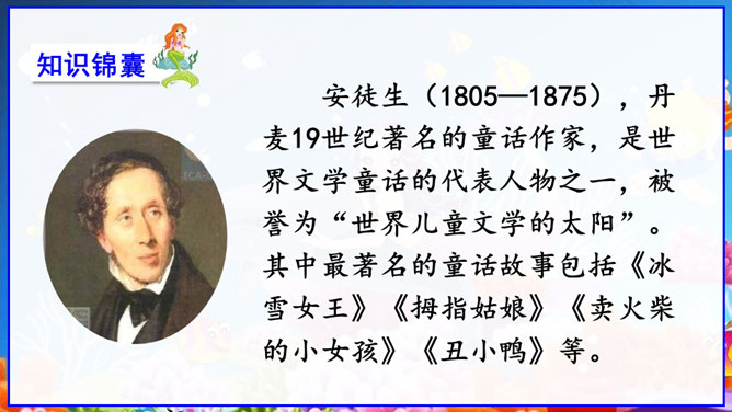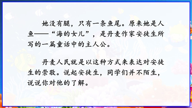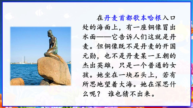 在丹麦首都歌本哈根入口处的海面上,有一座铜像冒出水面——它告诉人们这就是丹麦。但铜像既不是丹麦的开国元勋,也不是丹麦某一王朝的杰出英雄,只是一个普通的女孩。她坐在一块石头上,若有所思地望着大海。她在深思什么呢? 谁也猜不出来。她没有腿,只有一条鱼尾。原来她是人鱼——“海的女儿”,是丹麦作家安徒生所写的一篇童话中的主人公。丹麦人民就是以这种方式来表达对安徒生的崇敬。说起安徒生,同学们并不陌生,说说你对他的了解。所属专题:海的女儿ppt。
