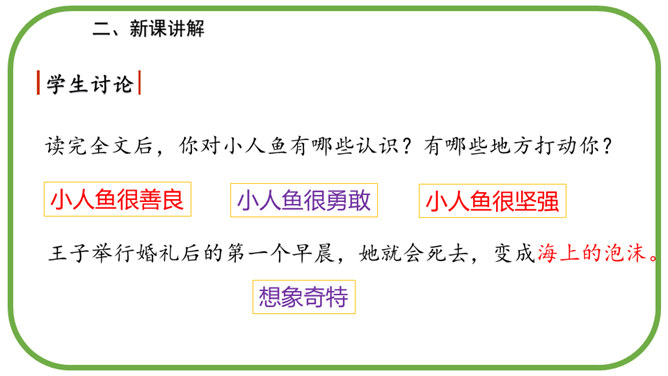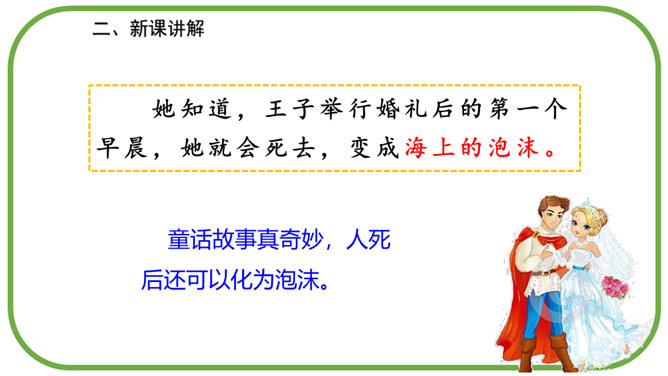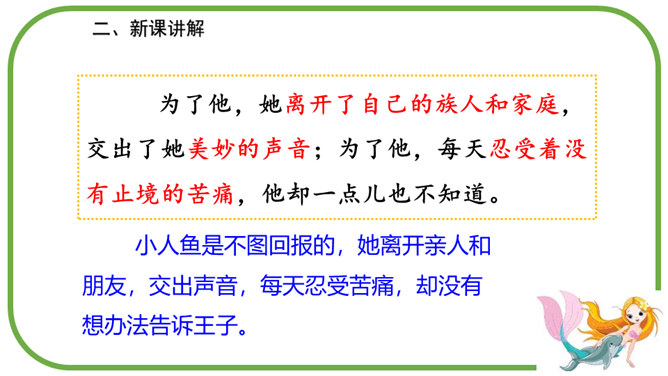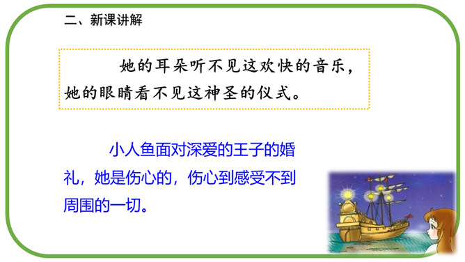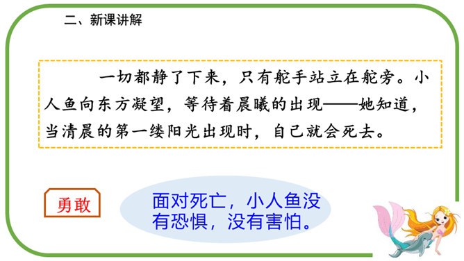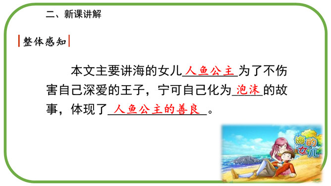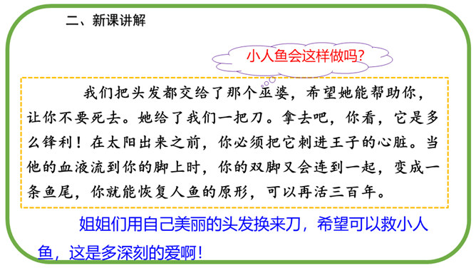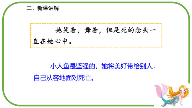 在海的远处,水是那么蓝,像最美丽的矢车菊花瓣,同时又是那么清,像最明亮的玻璃。海底的人就住在这下面。童话故事真奇妙,人死后还可以化为泡沫。小人鱼面对深爱的王子的婚礼,她是伤心的,伤心到感受不到周围的一切。小人鱼是不图回报的,她离开亲人和朋友,交出声音,每天忍受苦痛,却没有想办法告诉王子。小人鱼是坚强的,她将美好带给别人,自己从容地面对死亡。所属专题:海的女儿ppt。