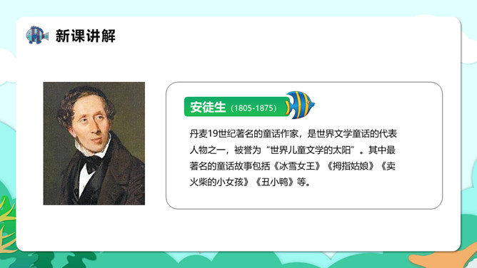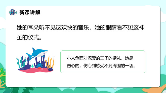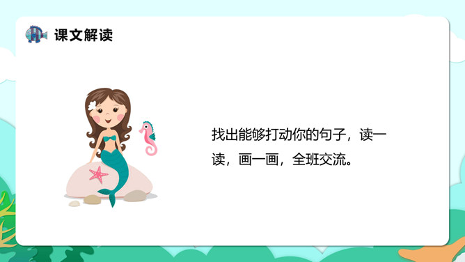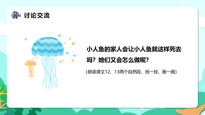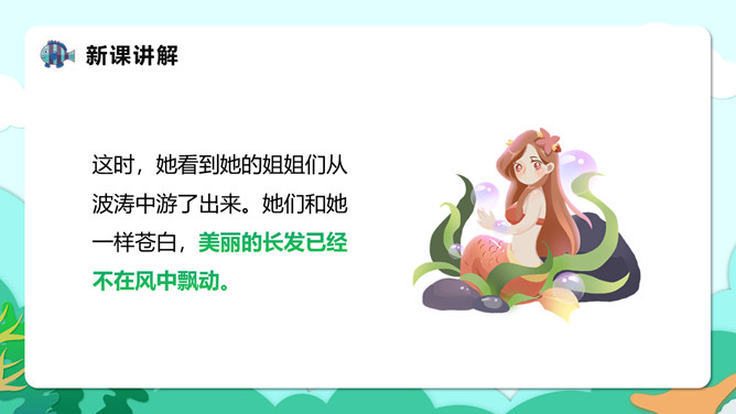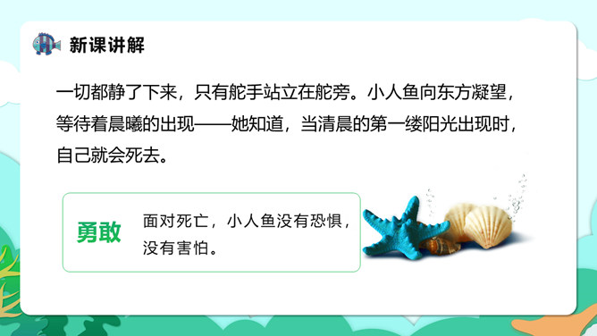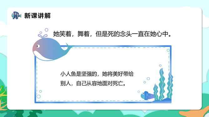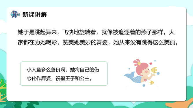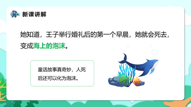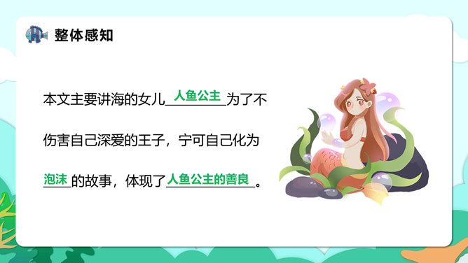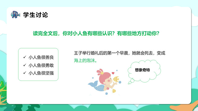 小人鱼的善良、勇敢令人感动,我要把描写她性格的句子多读几遍。小人鱼太执着了,宁可自己化为泡沫,也不伤害王子。姐姐们用自己美丽的头发换来刀,希望可以救小人鱼,这是多深刻的爱啊!小人鱼的家人会让小人鱼就这样死去吗?她们又会怎么做呢?小人鱼是坚强的,她将美好带给别人,自己从容地面对死亡。小人鱼是不图回报的,她离开亲人和朋友,交出声音,每天忍受苦痛,却没有想办法告诉王子。所属专题:海的女儿ppt。