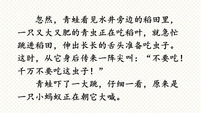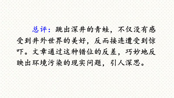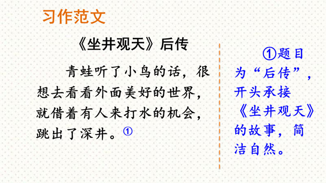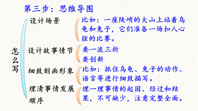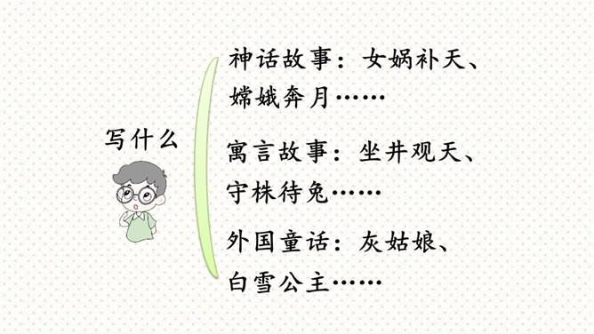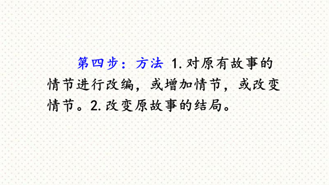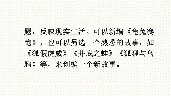 这次习作是在原有的童话故事的基础上,重新编一个故事。要求我们选择一个自己熟悉的童话或寓言故事,对其中的人物形象和故事情节进行改编,从而形成一个新的故事,以此表达一种新的思想或主题,反映现实生活。可以新编《龟兔赛跑》,也可以另选一个熟悉的故事,如《狐假虎威》《井底之蛙》《狐狸与乌鸦》等,来创编一个新故事。第一步:审题 根据提示选择一个大家都熟悉的故事,发挥想象,重新改编故事内容。第二步:立意 主题积极向上,体现故事中主人公的真善美。所属专题:故事新编ppt。