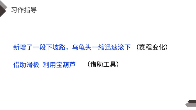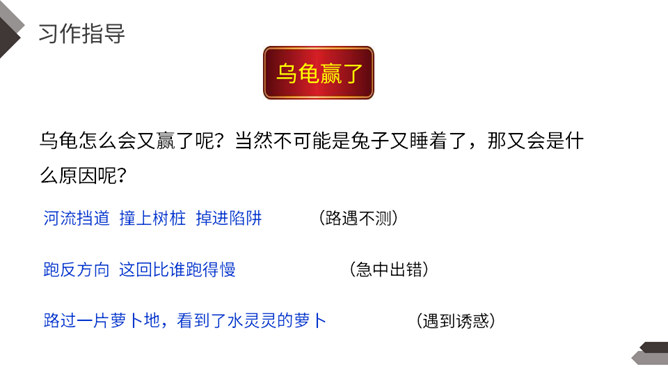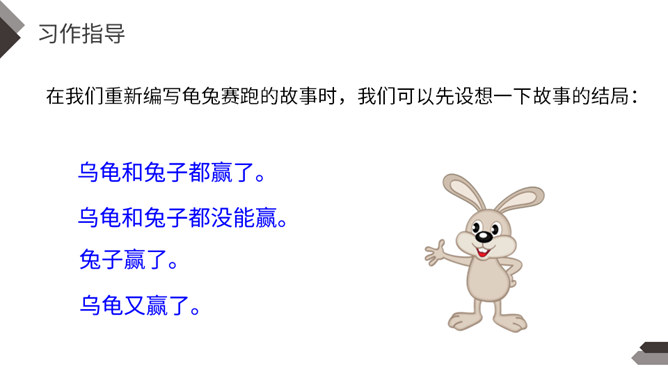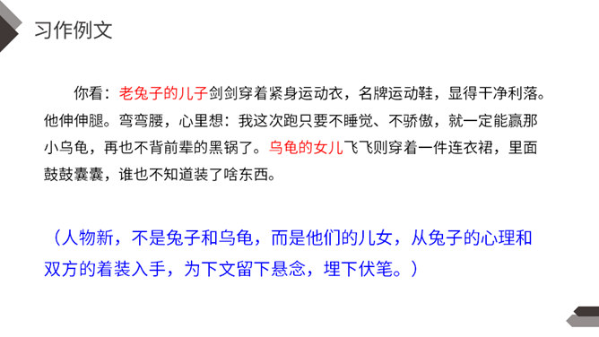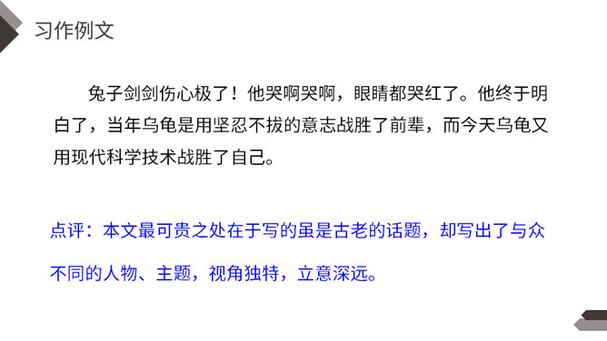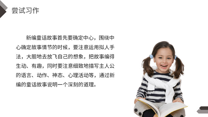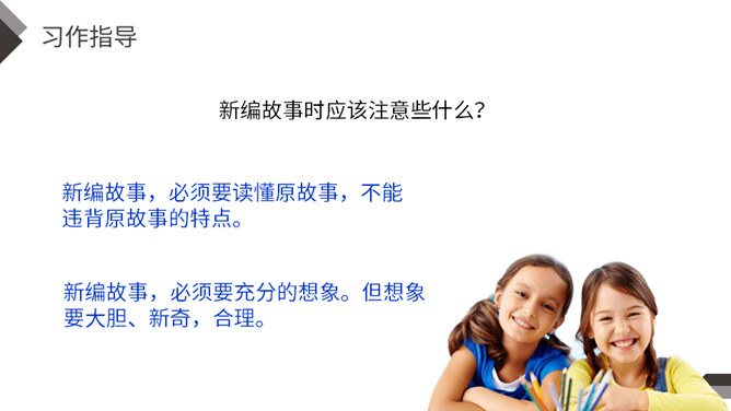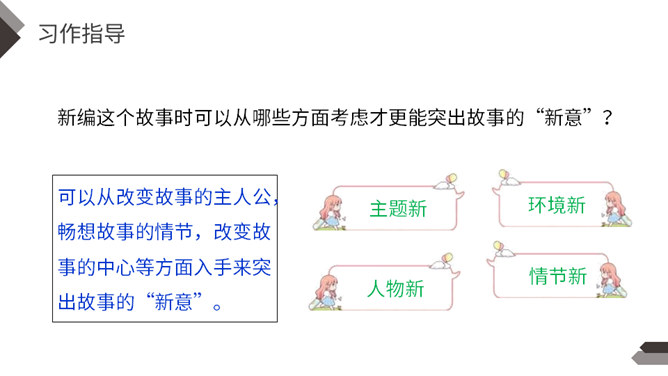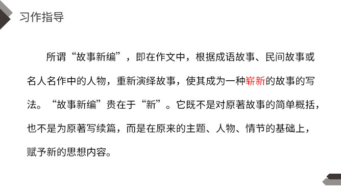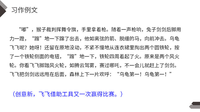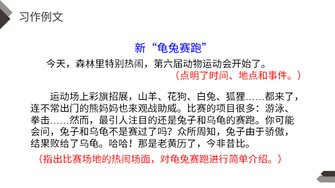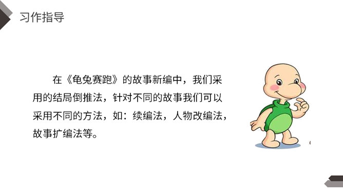 所谓“故事新编”,即在作文中,根据成语故事、民间故事或名人名作中的人物,重新演绎故事,使其成为一种崭新的故事的写法。“故事新编”贵在于“新”。它既不是对原著故事的简单概括,也不是为原著写续篇,而是在原来的主题、人物、情节的基础上,赋予新的思想内容。在《龟兔赛跑》的故事新编中,我们采用的结局倒推法,针对不同的故事我们可以采用不同的方法,如:续编法,人物改编法,故事扩编法等。所属专题:故事新编ppt。