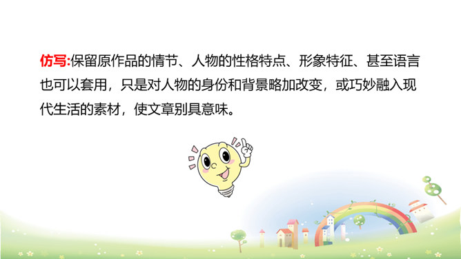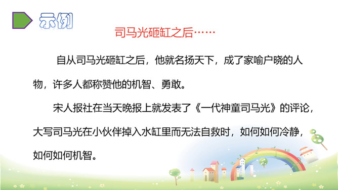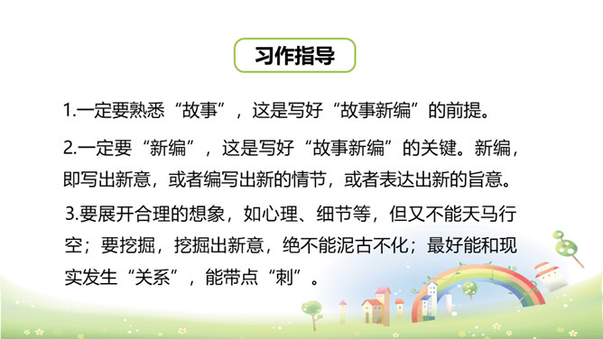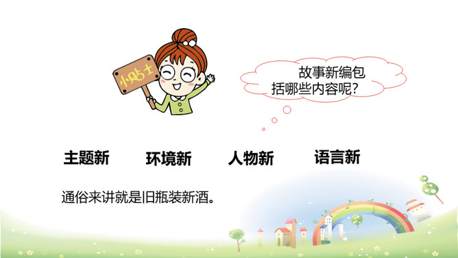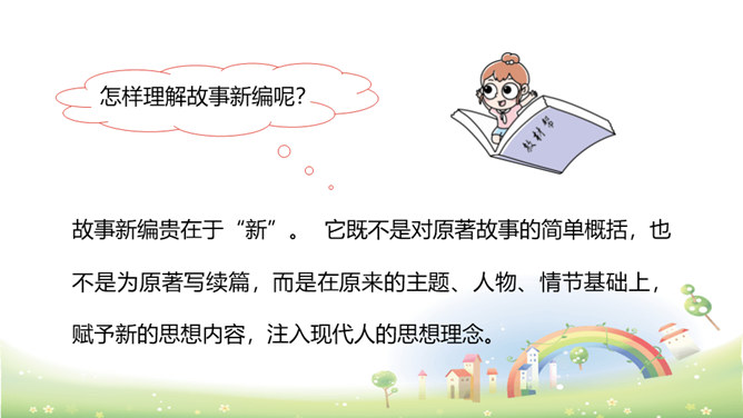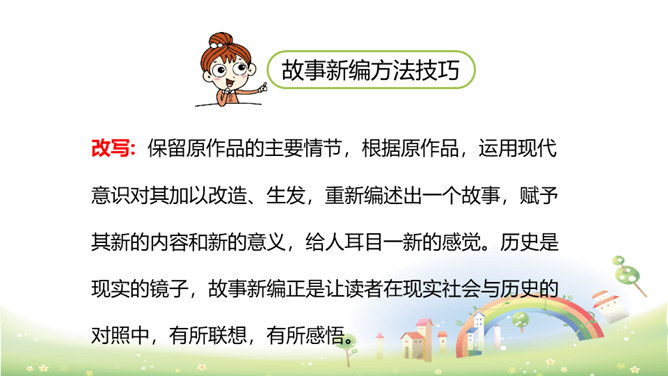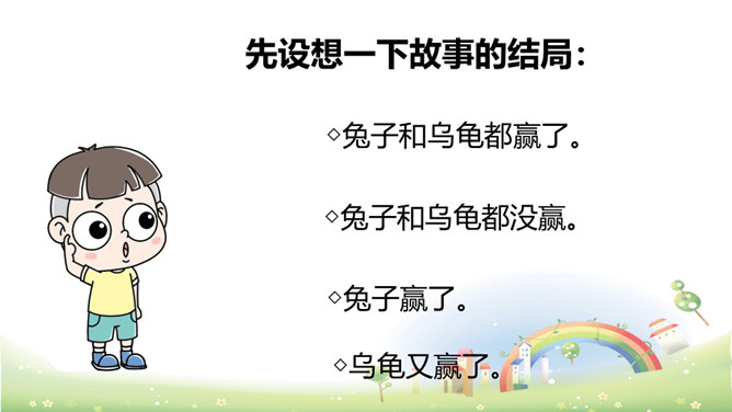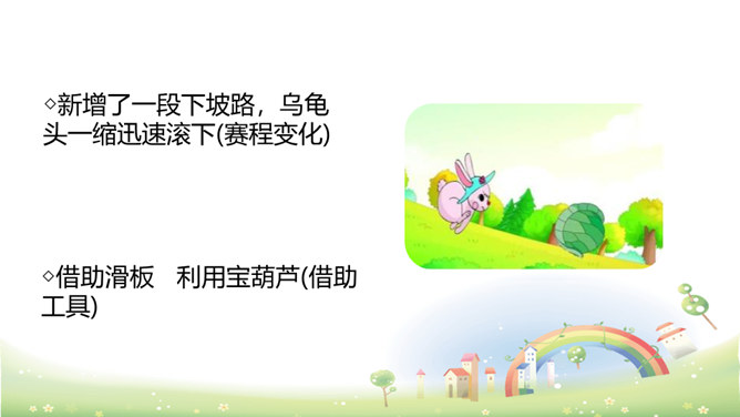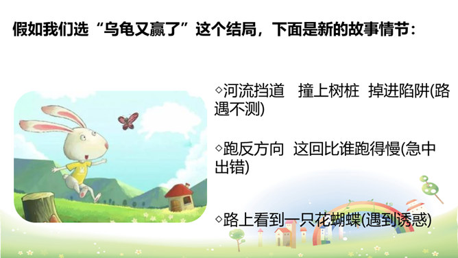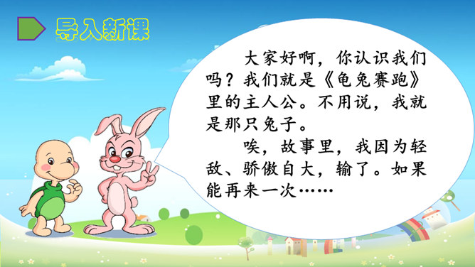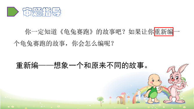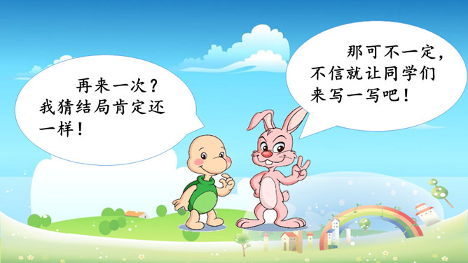大家好啊,你认识我们吗?我们就是《龟兔赛跑》里的主人公。不用说,我就是那只兔子。唉,故事里,我因为轻敌、骄傲自大,输了。如果能再来一次……再来一次?我猜结局肯定还一样!那可不一定,不信就让同学们来写一写吧!改写: 保留原作品的主要情节,根据原作品,运用现代意识对其加以改造、生发,重新编述出一个故事,赋予其新的内容和新的意义,给人耳目一新的感觉。历史是现实的镜子,故事新编正是让读者在现实社会与历史的对照中,有所联想,有所感悟。所属专题:故事新编ppt。