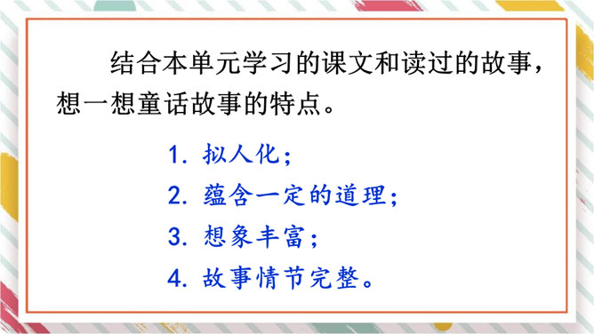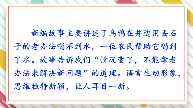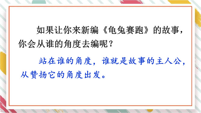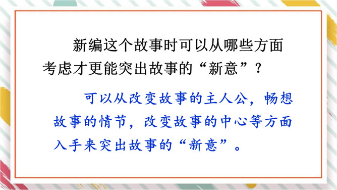 这个新编故事新增了一个角色,他是谁?这个新编的故事有意思吗?这个故事主要讲述了什么?结合本单元学习的课文和读过的故事,想一想童话故事的特点。新编童话故事首先要确定中心,围绕中心确定故事情节的时候,要注意运用拟人手法,大胆地去放飞自己的想象,把故事编得生动、有趣,同时要注意细致地描写主人公的语言、动作、神态、心理活动等,通过新编的童话故事说明一个深刻的道理,表现人物的真善美的形象。所属专题:故事新编ppt。