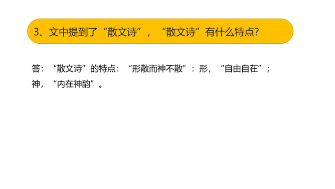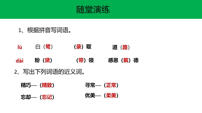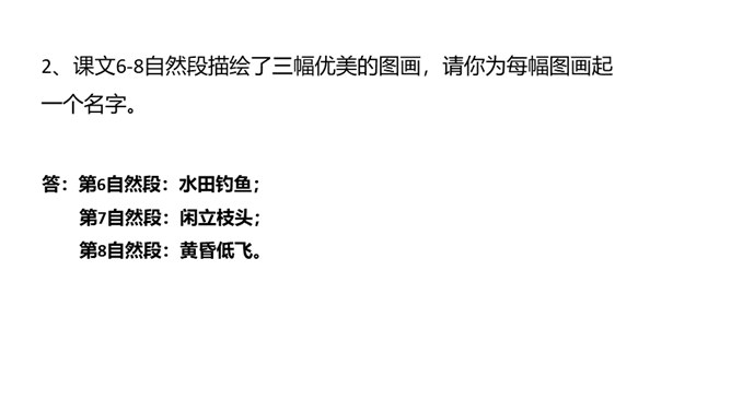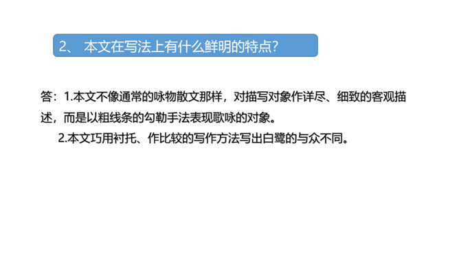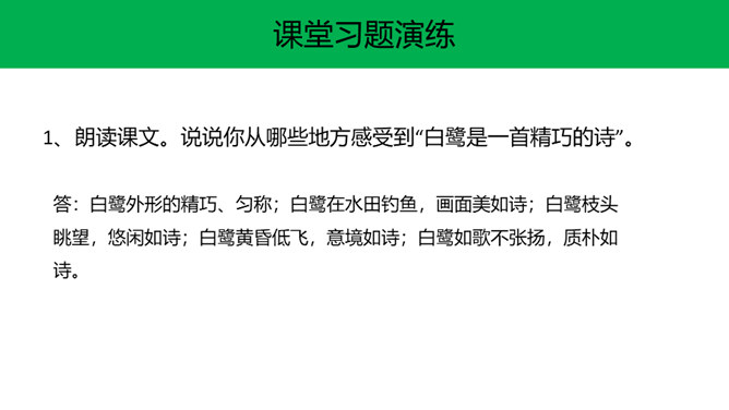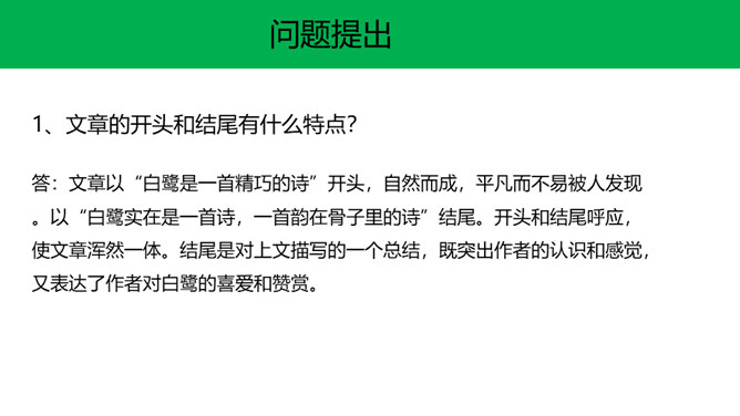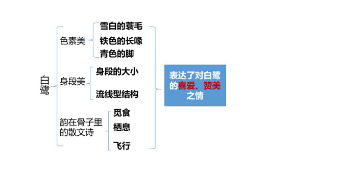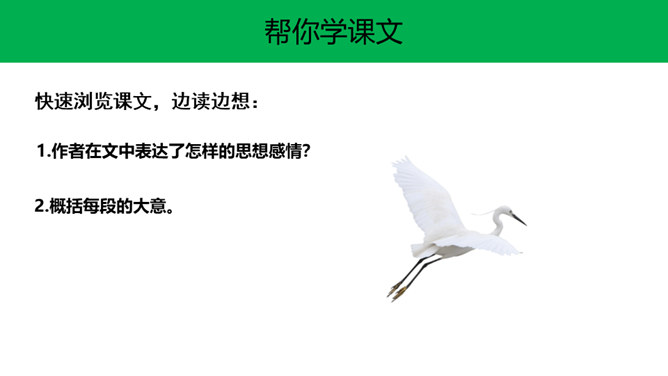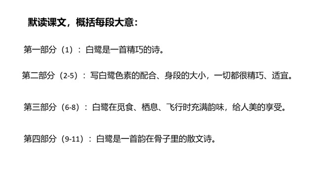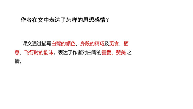 快速浏览课文,边读边想:1.作者在文中表达了怎样的思想感情?2.概括每段的大意。 作者在文中表达了怎样的思想感情?课文通过描写白鹭的颜色、身段的精巧及觅食、栖息、飞行时的韵味,表达了作者对白鹭的喜爱、赞美 之情。文章以“白鹭是一首精巧的诗”开头,自然而成,平凡而不易被人发现。以“白鹭实在是一首诗,一首韵在骨子里的诗”结尾。开头和结尾呼应,使文章浑然一体。结尾是对上文描写的一个总结,既突出作者的认识和感觉,又表达了作者对白鹭的喜爱和赞赏。所属专题:白鹭ppt。