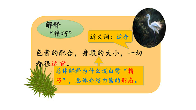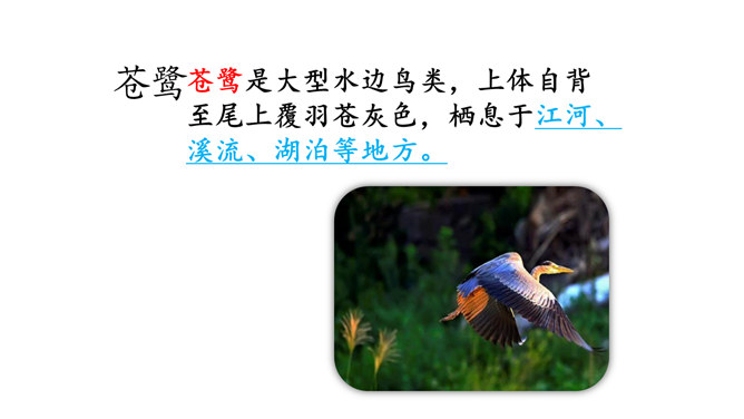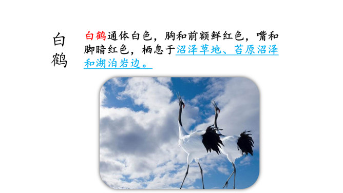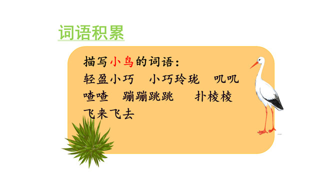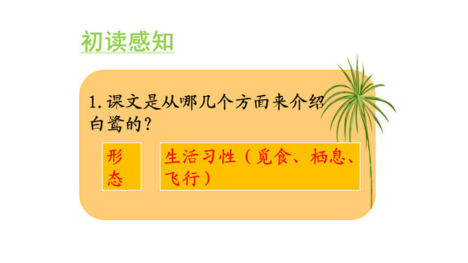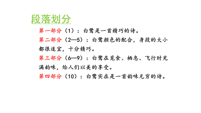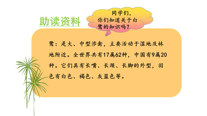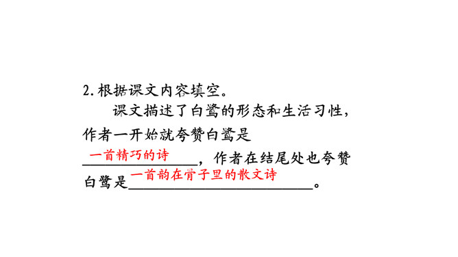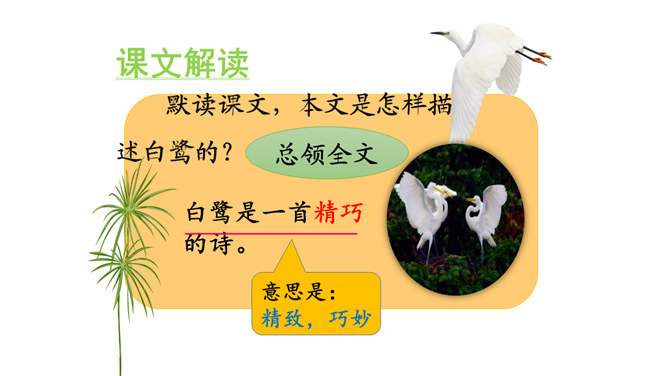 朗读课文。说说你从哪些地方感受到“白鹭是一首精巧的诗”。朗读指导:本文是一篇抒情散文,朗读时,要用欢快的语调和赞美的语气来读,声音清脆欢快但是语速不要过快,要体现出白鹭的优美来。课文第6~8自然段描绘了三幅优美的图画, 请你为每幅图画起一个名字。背诵课文。抄写你喜欢的自然段。背诵指导:可以熟读课文后,根据课文的段落分析,有条理的背诵课文。课下观察一种鸟类,请你以小短文的形式展示一下,写出这种小鸟的特点。所属专题:白鹭ppt。