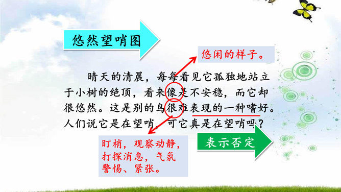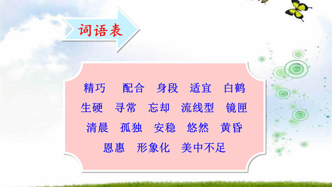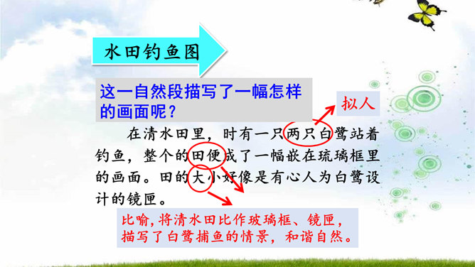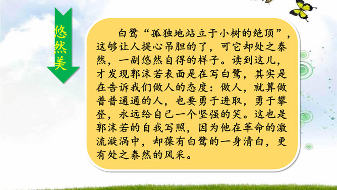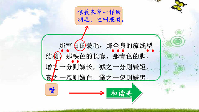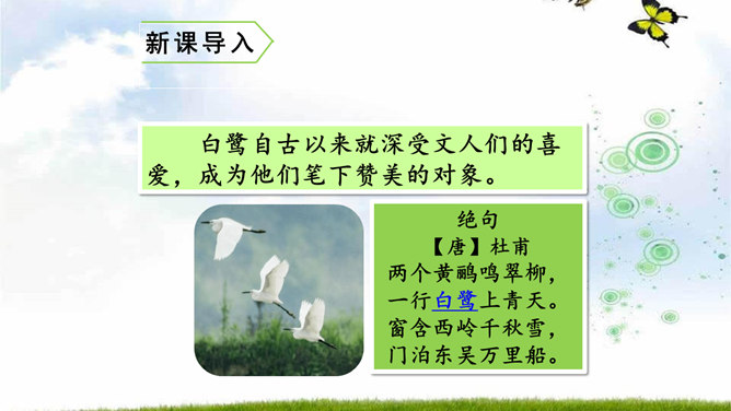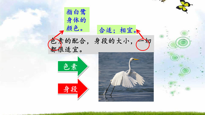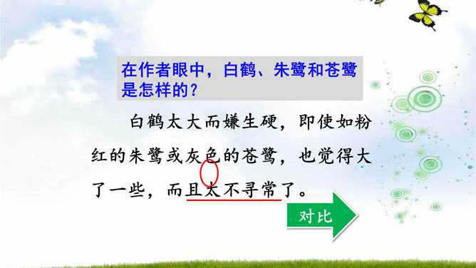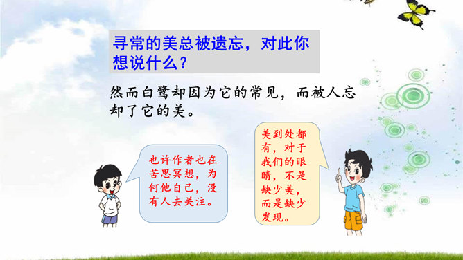文章的开头和结尾有什么特点?又有什么不同?白鹭是一首精巧的诗。白鹭实在是一首诗,一首韵在骨子里的散文诗。开头和结尾相互照应,都把白鹭比作诗。不同的是开头把白鹭比作精巧的诗,点明了白鹭的精巧;而结尾把白鹭比作韵在骨子里的散文诗,体现了白鹭自然天成之美。这篇文质兼美的散文,生动、细腻地描写了白鹭外形的精巧以及田间钓鱼、树顶望哨、黄昏低飞时的韵味,展现了白鹭独特的美,字里行间流露出作者对白鹭的喜爱与赞美之情,给人以美的享受。所属专题:白鹭ppt。