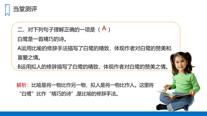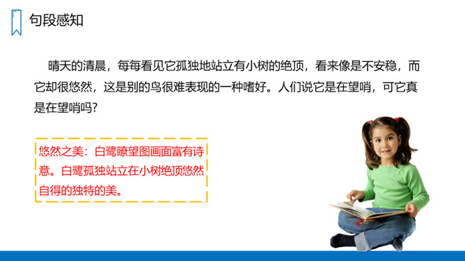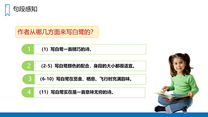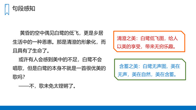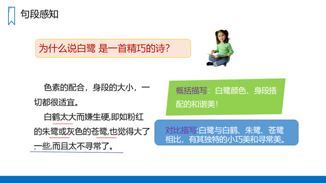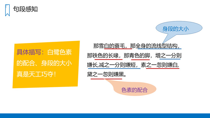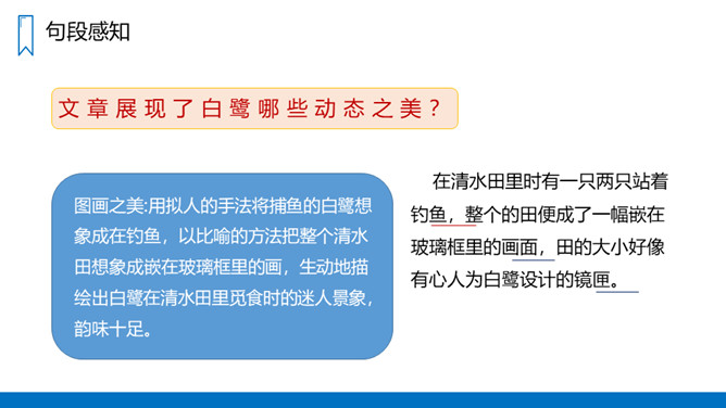 作者从哪几方面来写白鹭的?(1)写白鹭一首精巧的诗。(2-5)写白鹭颜色的配合,身段的大小都很适宜。(6-10)写白鹭在觅食、栖息、飞行时充满韵味。(11)写白鹭实在是一首意味无穷的诗。图画之美:用拟人的手法将捕鱼的白鹭想象成在钓鱼,以比喻的方法把整个清水田想象成嵌在玻璃框里的画,生动地描绘出白鹭在清水田里觅食时的迷人景象,韵味十足。概括描写:白鹭颜色、身段搭配的和谐美!所属专题:白鹭ppt。