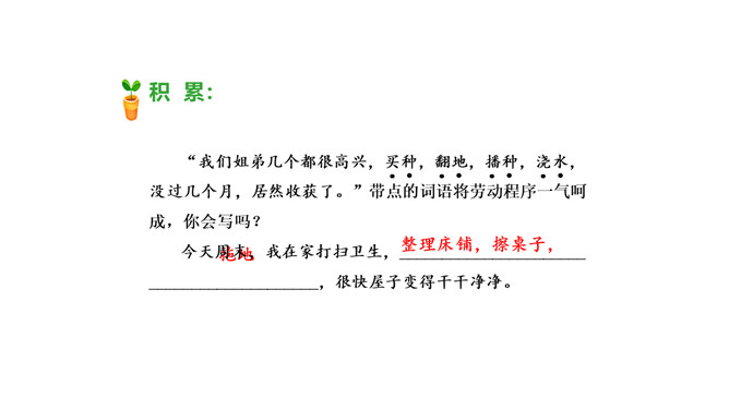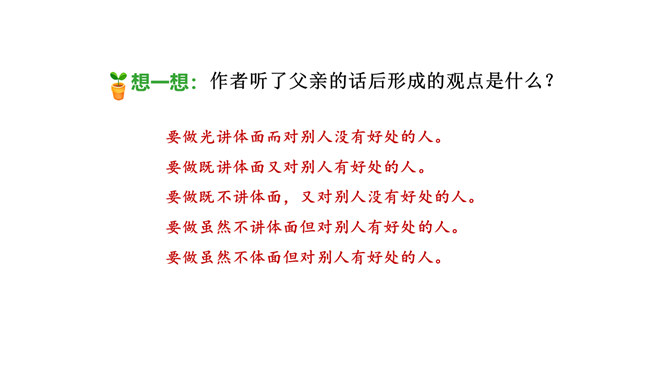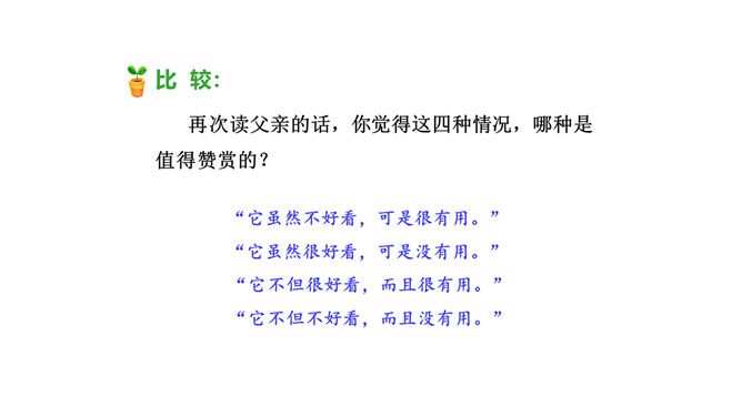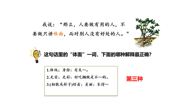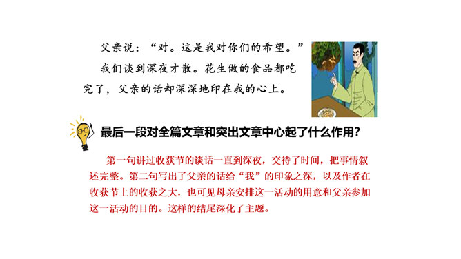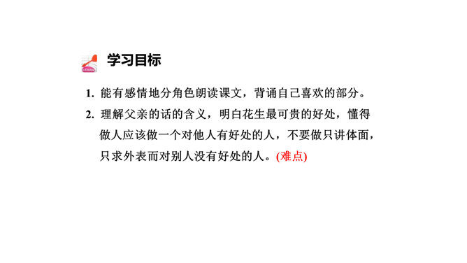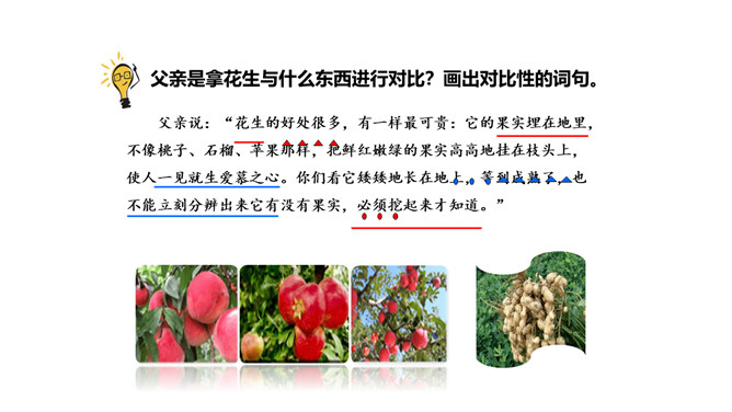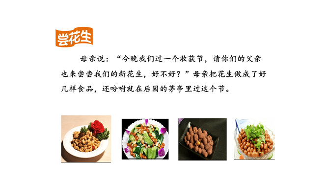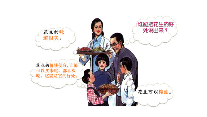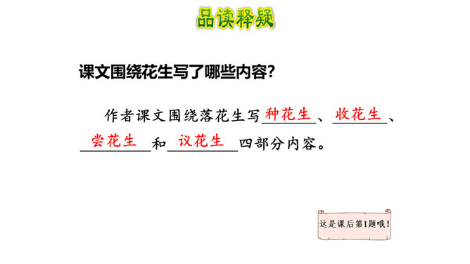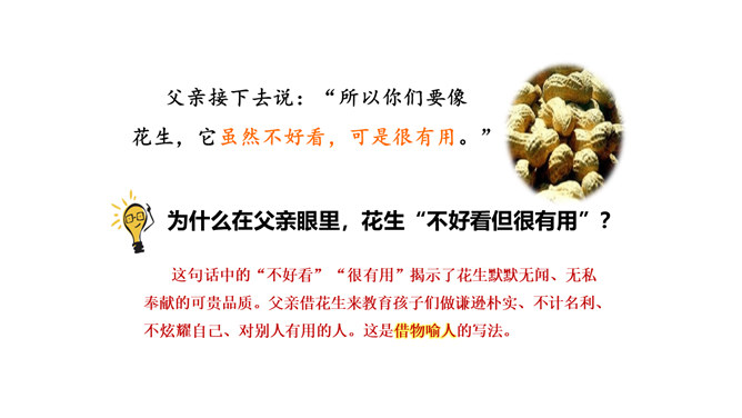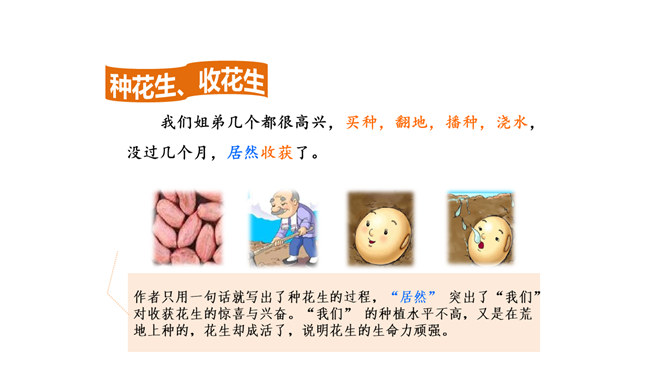 1. 能有感情地分角色朗读课文,背诵自己喜欢的部分。2. 理解父亲的话的含义,明白花生最可贵的好处,懂得做人应该做一个对他人有好处的人,不要做只讲体面,只求外表而对别人没有好处的人。(难点)作者只用一句话就写出了种花生的过程,“居然” 突出了“我们” 对收获花生的惊喜与兴奋。“我们” 的种植水平不高,又是在荒地上种的,花生却成活了,说明花生的生命力顽强。所属专题:落花生ppt。