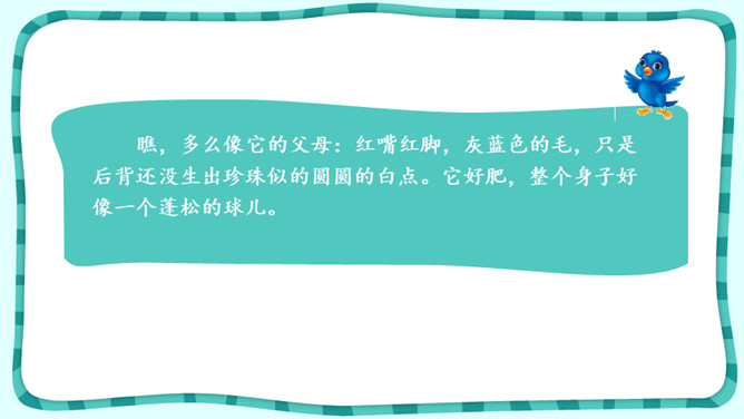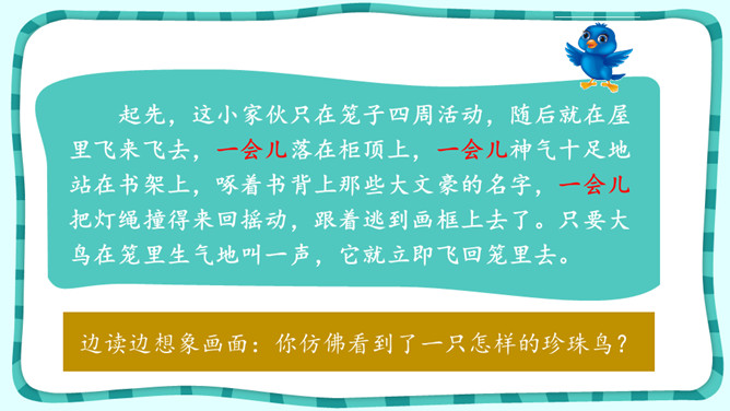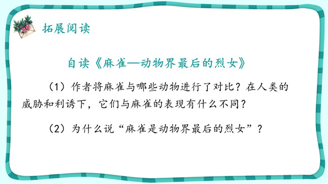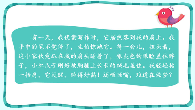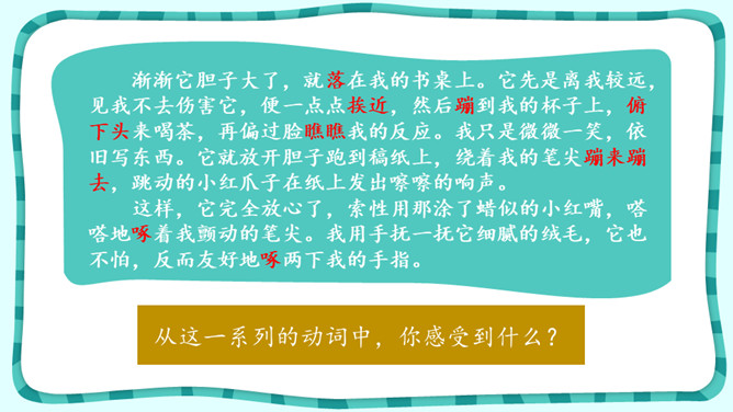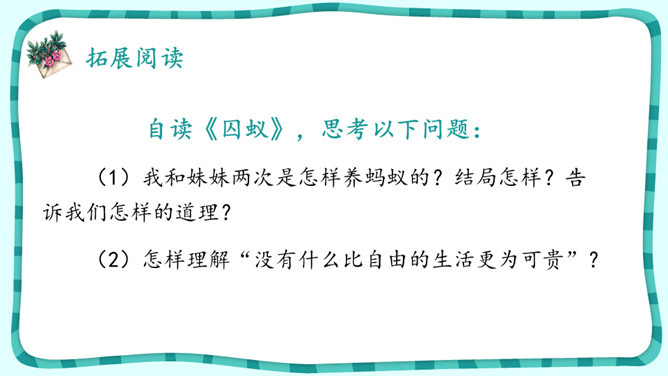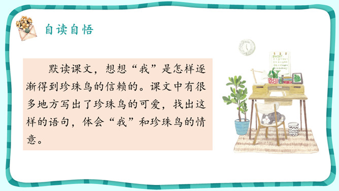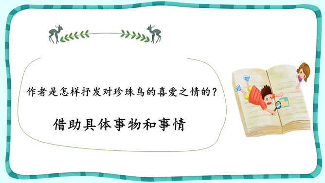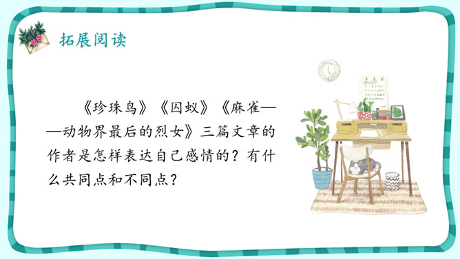 默读课文,想想“我”是怎样逐渐得到珍珠鸟的信赖的。课文中有很多地方写出了珍珠鸟的可爱,找出这样的语句,体会“我”和珍珠鸟的情意。作者是怎样抒发对珍珠鸟的喜爱之情的?自读《囚蚁》,思考以下问题:我和妹妹两次是怎样养蚂蚁的?结局怎样?告诉我们怎样的道理?怎样理解“没有什么比自由的生活更为可贵”?《珍珠鸟》《囚蚁》《麻雀——动物界最后的烈女》三篇文章的作者是怎样表达自己感情的?有什么共同点和不同点?所属专题:珍珠鸟ppt。