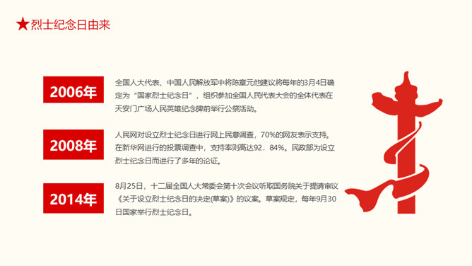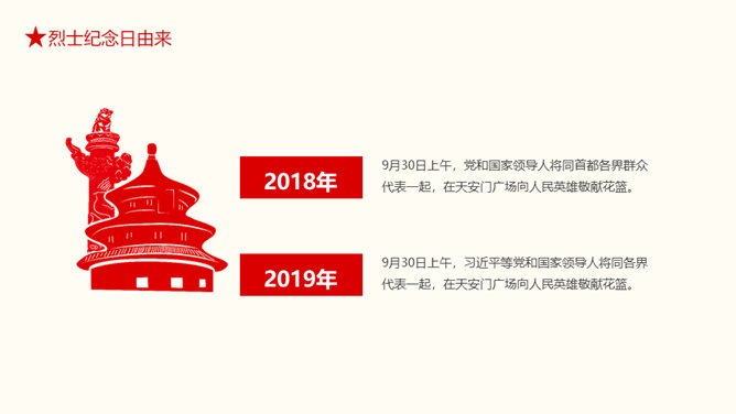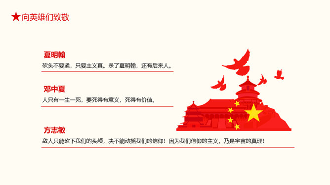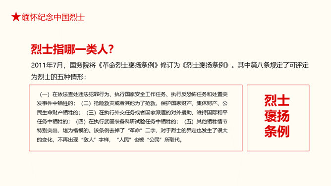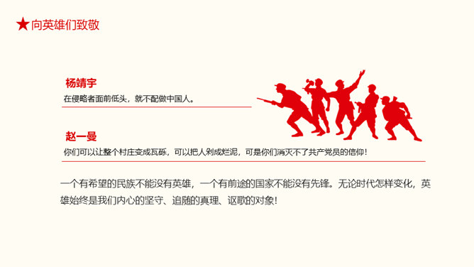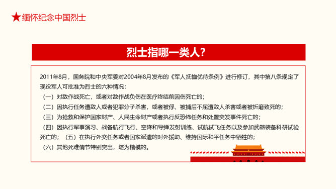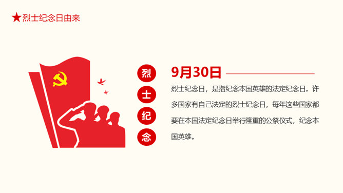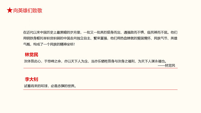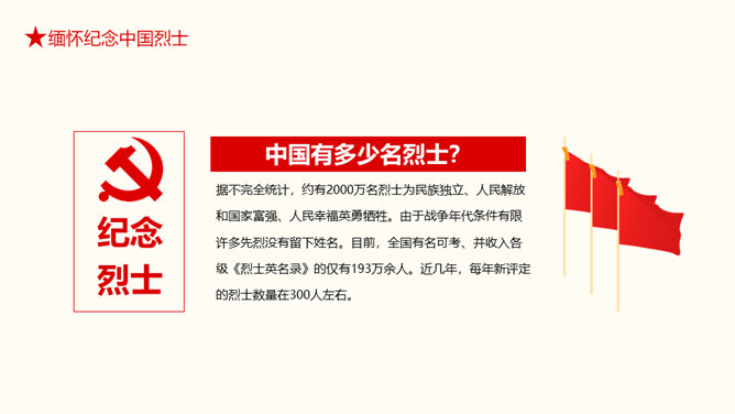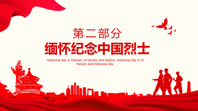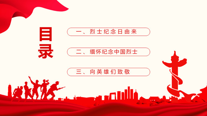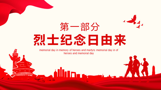 缅怀英雄烈士纪念日PPT模板。包括烈士纪念日由来、缅怀纪念中国烈士、向英雄们致敬几个部分。