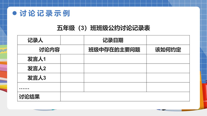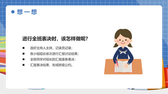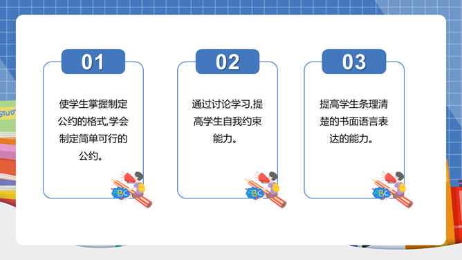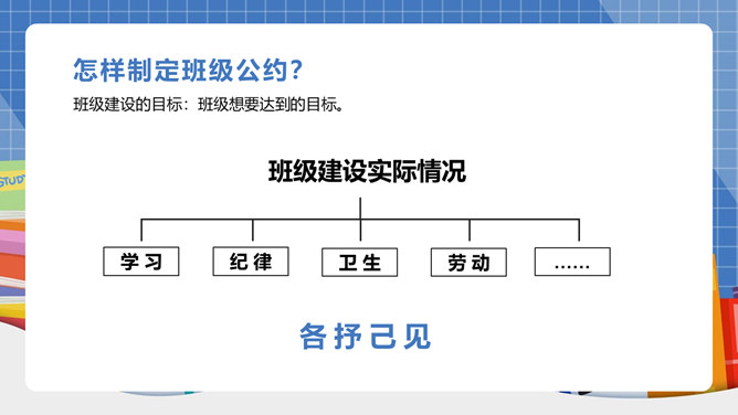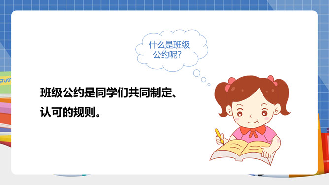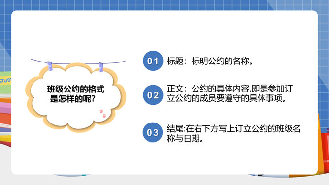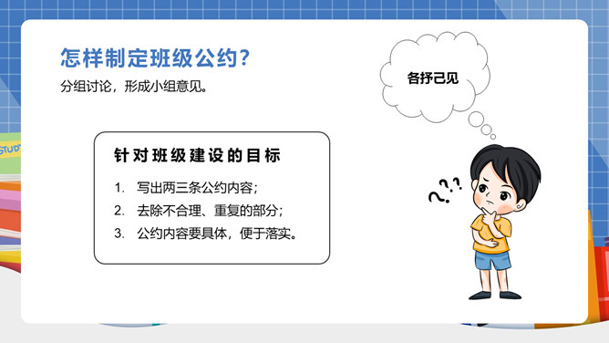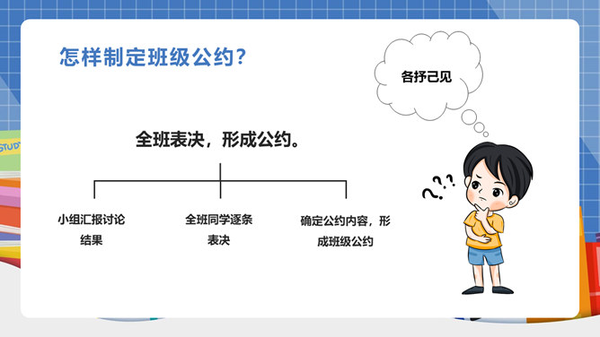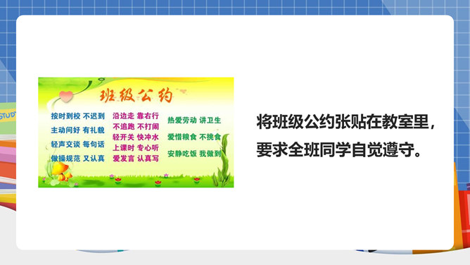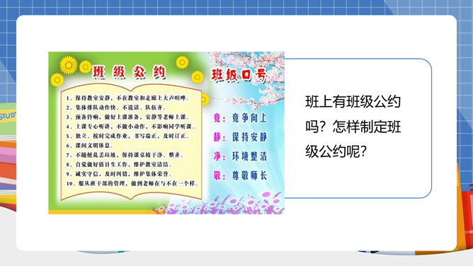 我们生活离不开“规则”二字!班上有班级公约吗?怎样制定班级公约呢?班级公约是同学们共同制定、认可的规则。班级公约的格式是怎样的呢?标题:标明公约的名称。正文:公约的具体内容,即是参加订立公约的成员要遵守的具体事项。结尾:在右下方写上订立公约的班级名称与日期。提前准备好与班级建设有关的内容;发言时要控制时间;认真听其他组员的发言;对其他组员的内容进行分析讨论。所属专题:制定班级公约ppt。