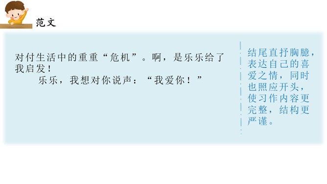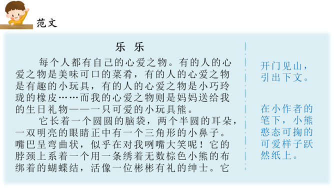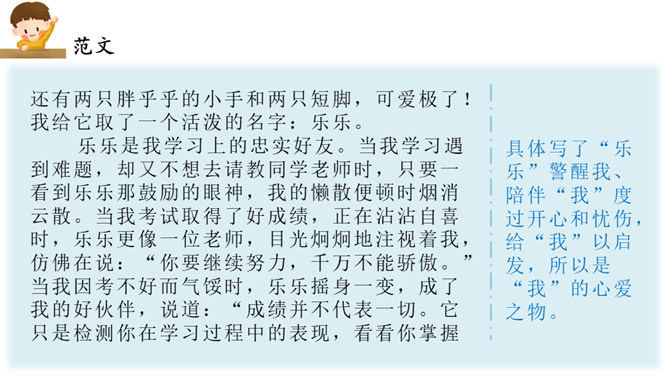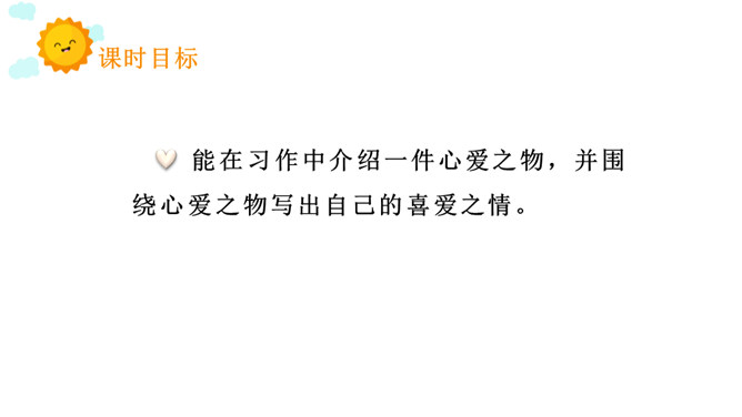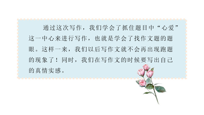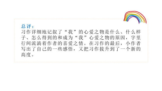 能在习作中介绍一件心爱之物,并围绕心爱之物写出自己的喜爱之情。心爱之物是什么?什么样子?怎么得到的?为什么会成为心爱之物?在习作的最后,小作者写出了自己的一些感悟,又把习作拔升到了一个新的高度。通过这次写作,我们学会了抓住题目中“心爱”这一中心来进行写作,也就是学会了找作文题的题眼。这样一来,我们以后写作文就不会再出现跑题的现象了!同时,我们在写作文的时候要写出自己的真情实感。所属专题:我的心爱之物ppt。