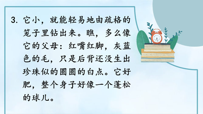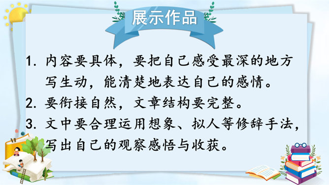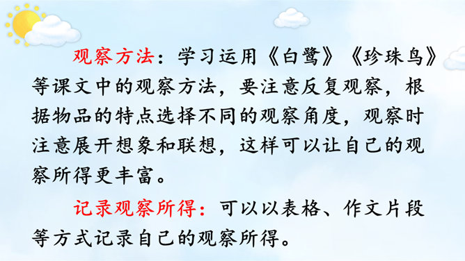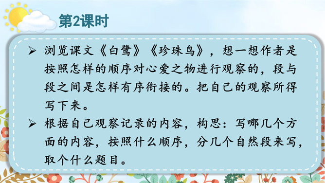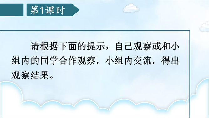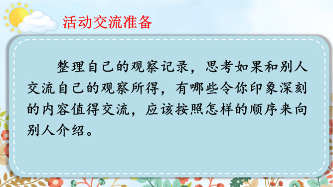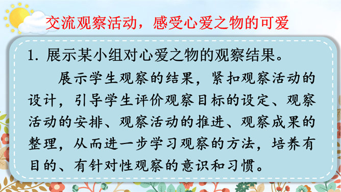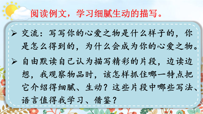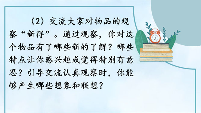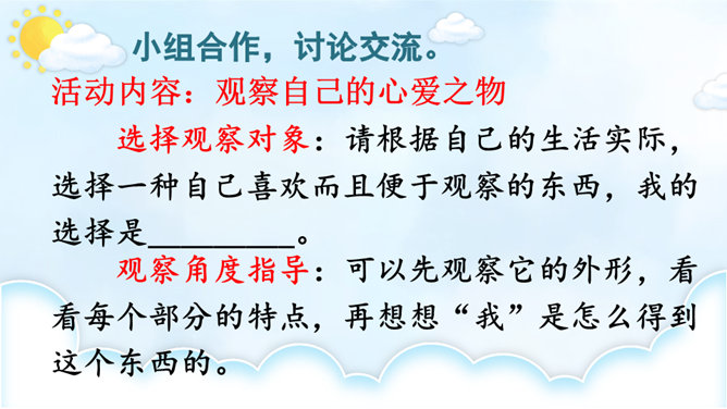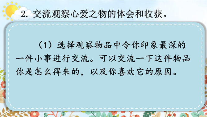 请根据下面的提示,自己观察或和小组内的同学合作观察,小组内交流,得出观察结果。整理自己的观察记录,思考如果和别人交流自己的观察所得,有哪些令你印象深刻的内容值得交流,应该按照怎样的顺序来向别人介绍。(1)选择观察物品中令你印象最深的一件小事进行交流。可以交流一下这件物品你是怎么得来的,以及你喜欢它的原因。(2)交流大家对物品的观察“新得”。通过观察,你对这个物品有了哪些新的了解?哪些特点让你感兴趣或觉得特别有意思?引导交流认真观察时,你能够产生哪些想象和联想?所属专题:我的心爱之物ppt。