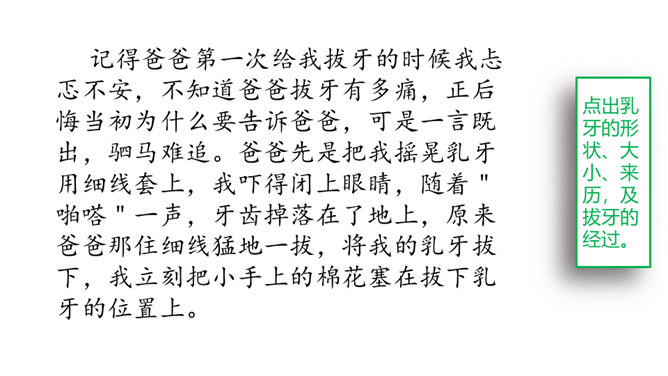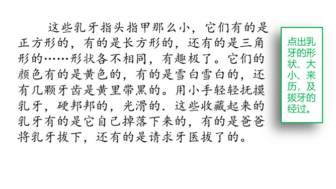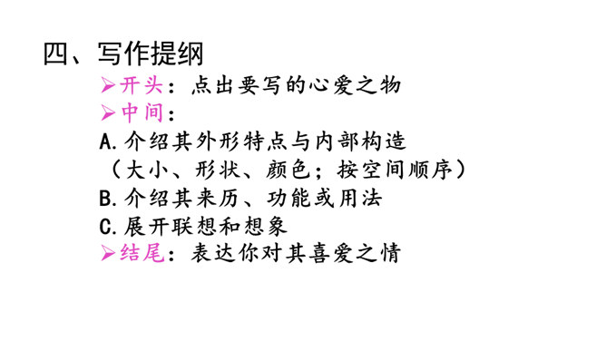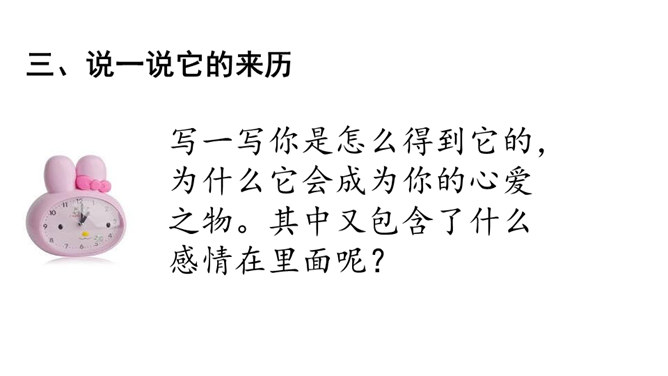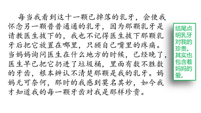 每个人都有自己特别钟爱的东西,像琦君笔下故乡的桂花,冯骥才眼中可爱的珍珠鸟。你的心爱之物又是什么呢?说一说:在生活中,有哪些东西是你的心爱之物?选择你最喜欢的、最好写的物品作为写作对象。写一写你是怎么得到它的,为什么它会成为你的心爱之物。其中又包含了什么感情在里面呢?心爱之物是乳牙,选材新颖。点出乳牙的形状、大小、来历,及拔牙的经过。结尾点明乳牙对我的珍贵。其实也包含着妈妈的爱。所属专题:我的心爱之物ppt。
