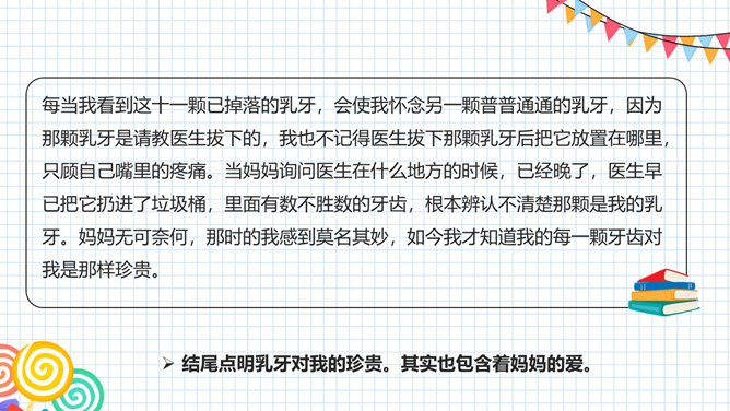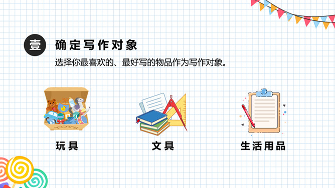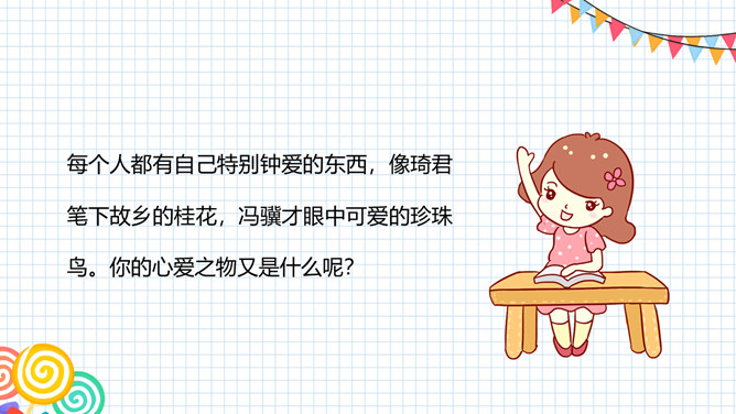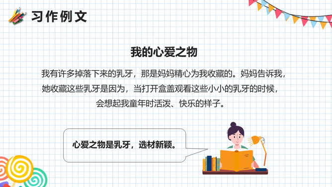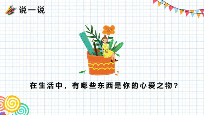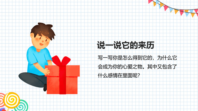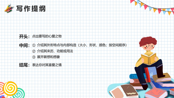 在生活中,有哪些东西是你的心爱之物?写一写你是怎么得到它的,为什么它会成为你的心爱之物。其中又包含了什么感情在里面呢?写作提纲,开头:点出要写的心爱之物。中间:介绍其外形特点与内部构造(大小、形状、颜色;按空间顺序)。介绍其来历、功能或用法。展开联想和想象。结尾:表达你对其喜爱之情。所属专题:我的心爱之物ppt。