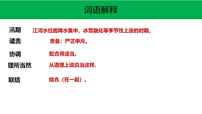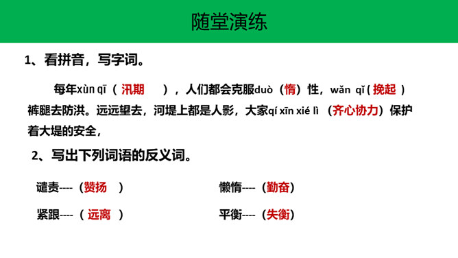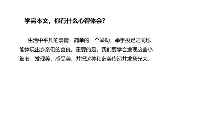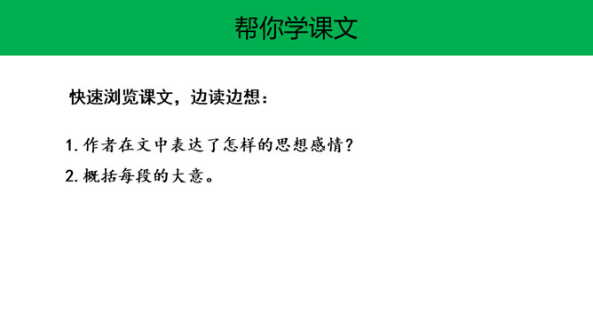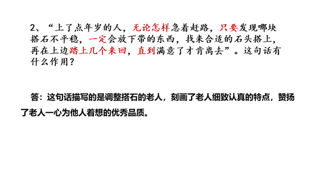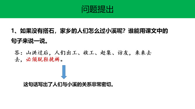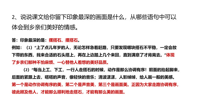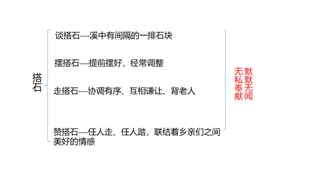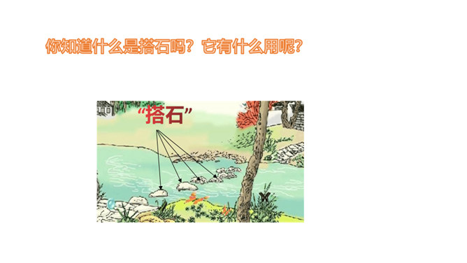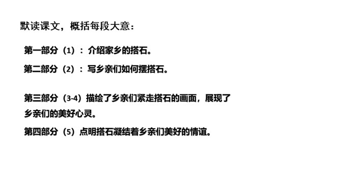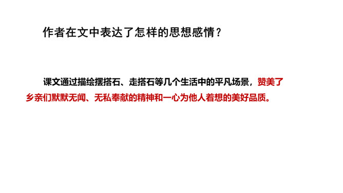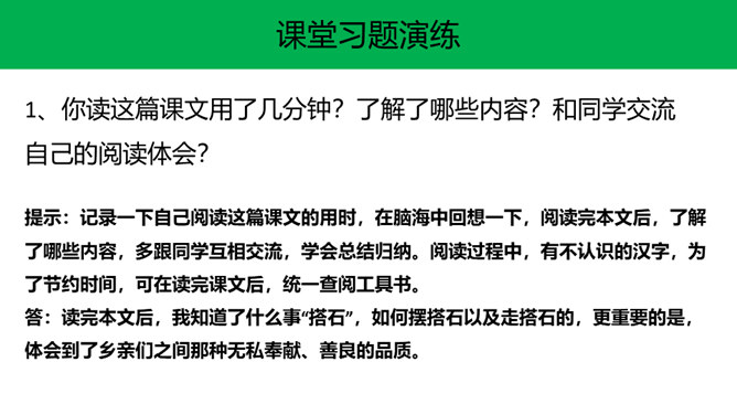 你读这篇课文用了几分钟?了解了哪些内容?和同学交流自己的阅读体会?提示:记录一下自己阅读这篇课文的用时,在脑海中回想一下,阅读完本文后,了解了哪些内容,多跟同学互相交流,学会总结归纳。阅读过程中,有不认识的汉字,为了节约时间,可在读完课文后,统一查阅工具书。答:读完本文后,我知道了什么事“搭石”,如何摆搭石以及走搭石的,更重要的是,体会到了乡亲们之间那种无私奉献、善良的品质。所属专题:搭石ppt。