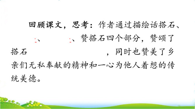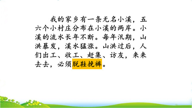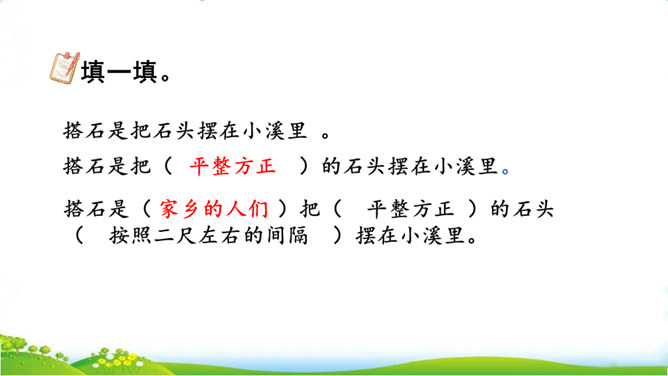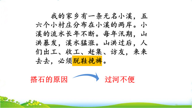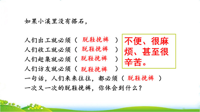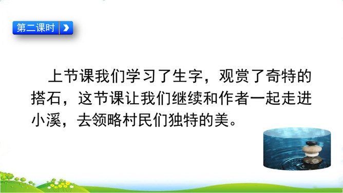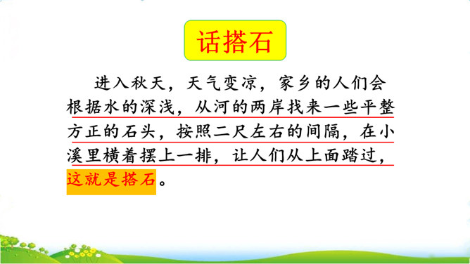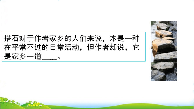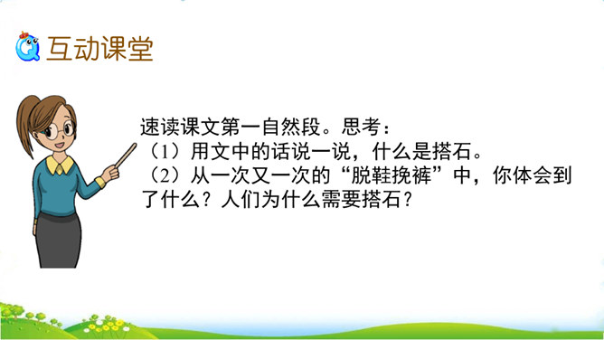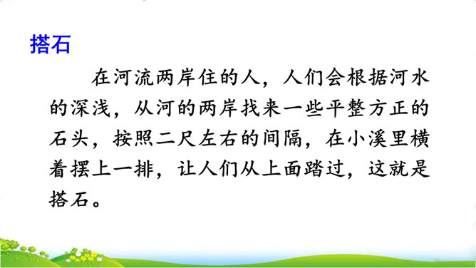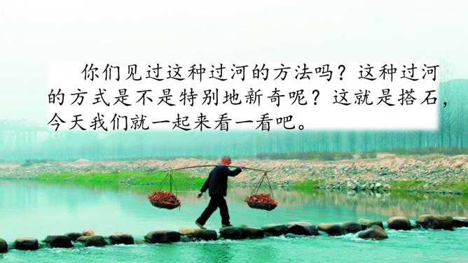 你们见过这种过河的方法吗?这种过河的方式是不是特别地新奇呢?这就是搭石,今天我们就一起来看一看吧。上节课我们学习了生字,观赏了奇特的搭石,这节课让我们继续和作者一起走进小溪,去领略村民们独特的美。速读课文第一自然段。思考:(1)用文中的话说一说,什么是搭石。(2)从一次又一次的“脱鞋挽裤”中,你体会到了什么?人们为什么需要搭石?老人踩到不稳的搭石会怎样想,他的表情、动作会怎样?所属专题:搭石ppt。