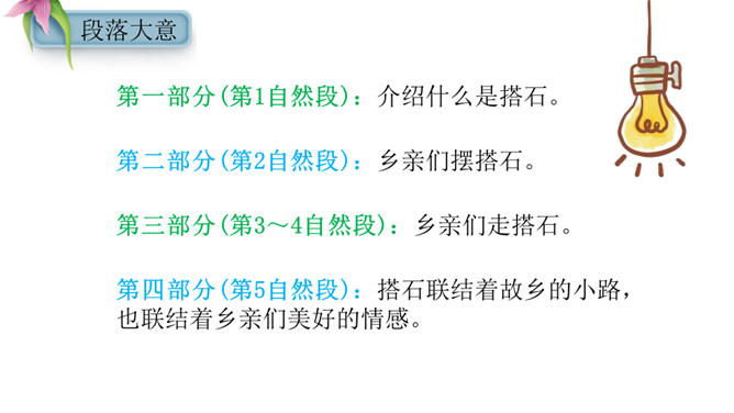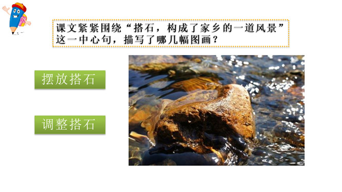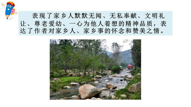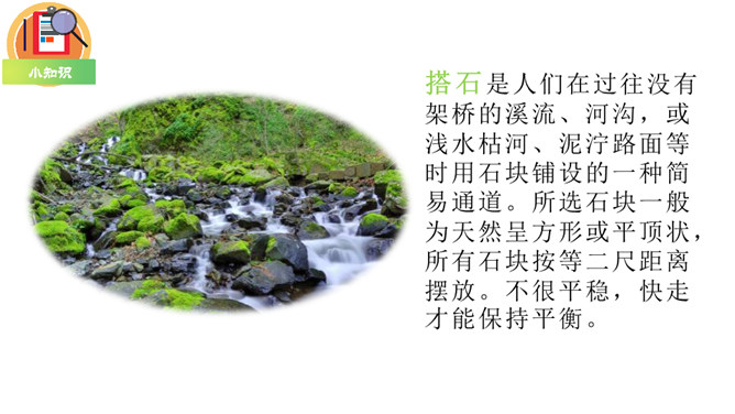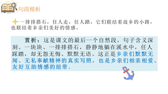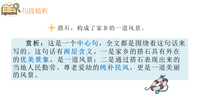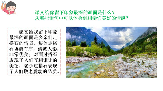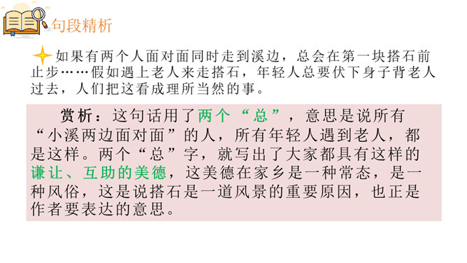 赏析:这是一个中心句,全文都是围绕着这句话来写的。这句话有两层含义,一是家乡的搭石具有外在的优美景象,是一道风景;二是通过搭石表现出来的当地人民勤劳、尊老爱幼的纯朴民风,更是一道美丽的风景。赏析:这句话用了两个 “总”,意思是说所有“小溪两边面对面”的人,所有年轻人遇到老人,都是这样。两个“总”字,就写出了大家都具有这样的谦让、互助的美德,这美德在家乡是一种常态,是一种风俗,这是说搭石是一道风景的重要原因,也正是作者要表达的意思。所属专题:搭石ppt。
