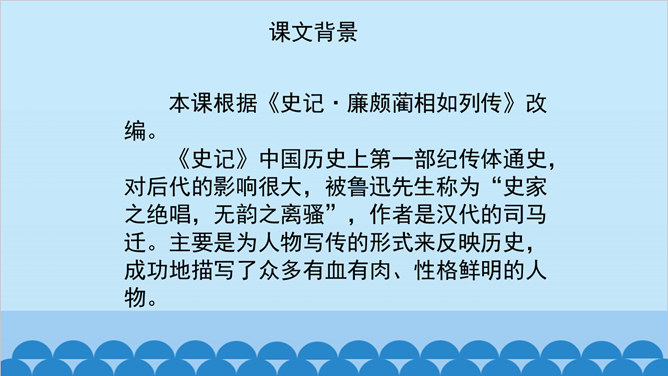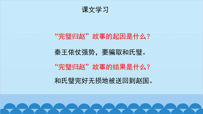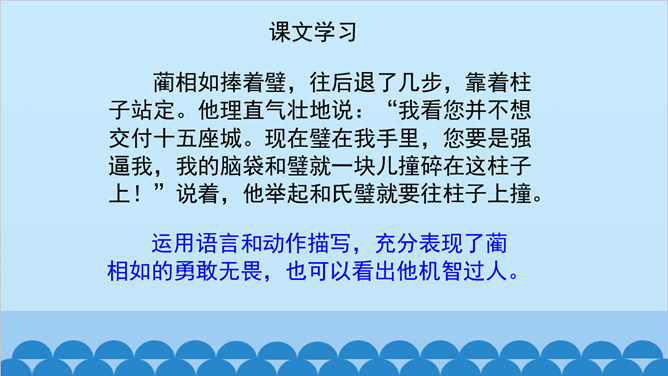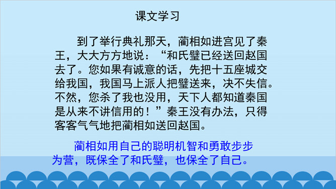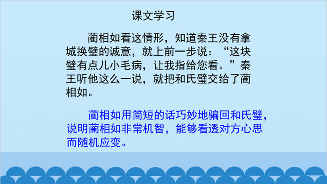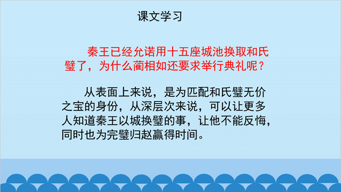 本课根据《廉颇蔺相如列传》改编。理解课文内容,体会人物顾全大局、爱国的思想和他们各自的美好品质。学习作者抓住人物的语言、动作、神态来刻画人物的写作手法。领悟三个小故事之间的内在联系。蔺相如用简短的话巧妙地骗回和氏璧,说明蔺相如非常机智,能够看透对方心思而随机应变。运用语言和动作描写,充分表现了蔺相如的勇敢无畏,也可以看出他机智过人。王已经允诺用十五座城池换取和氏璧了,为什么蔺相如还要求举行典礼呢?