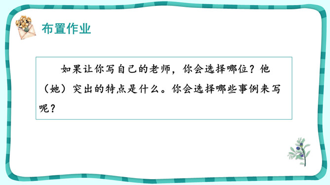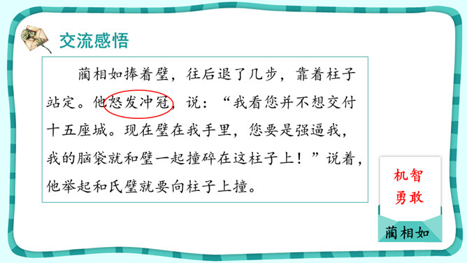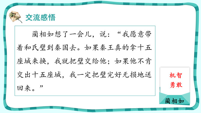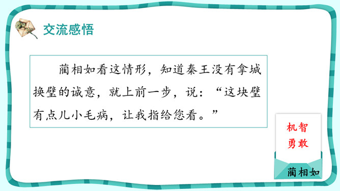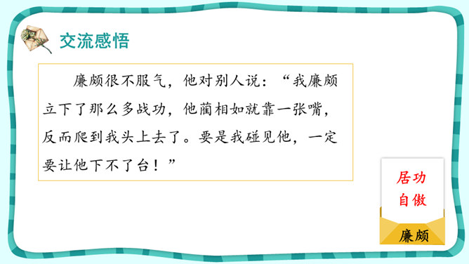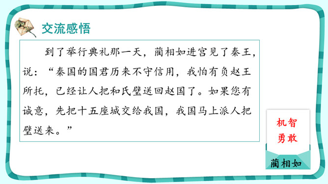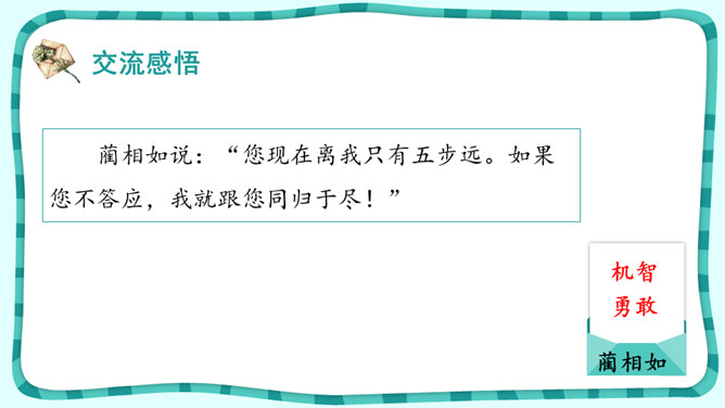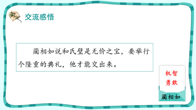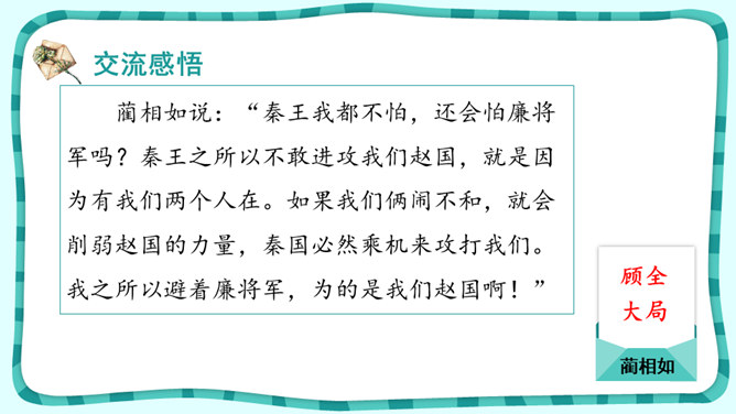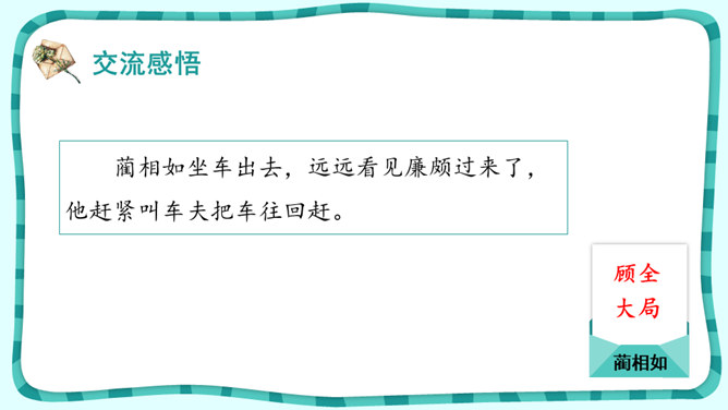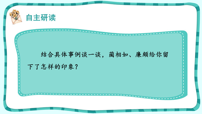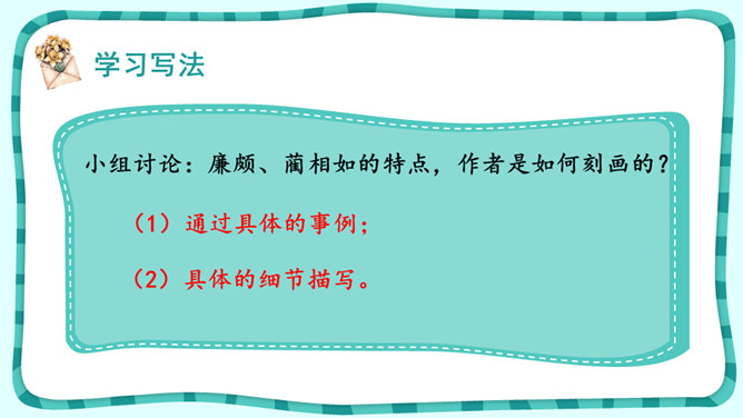 结合具体事例谈一谈,蔺相如、廉颇给你留下了怎样的印象?小组讨论:廉颇、蔺相如的特点,作者是如何刻画的?(1)通过具体的事例;(2)具体的细节描写。如果让你写自己的老师,你会选择哪位?他(她)突出的特点是什么。你会选择哪些事例来写呢?