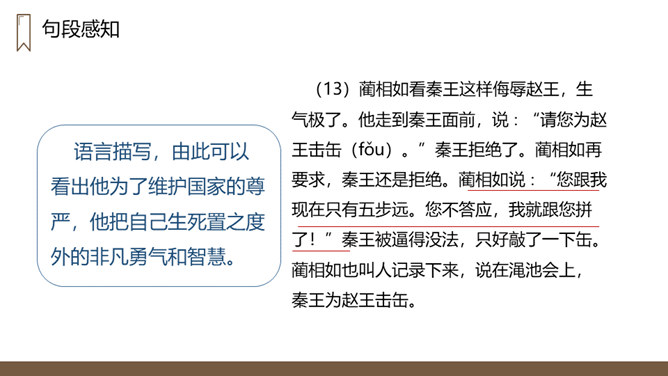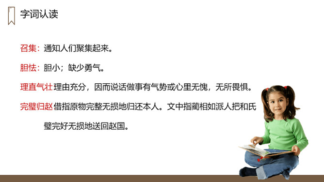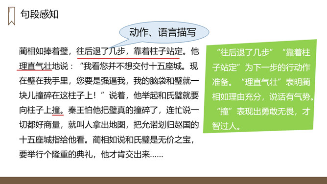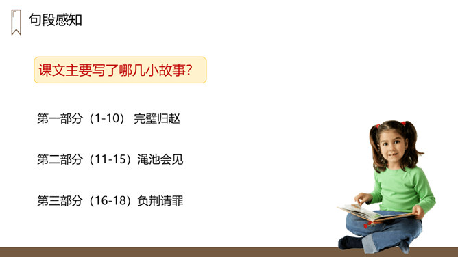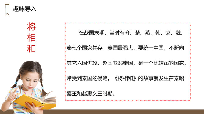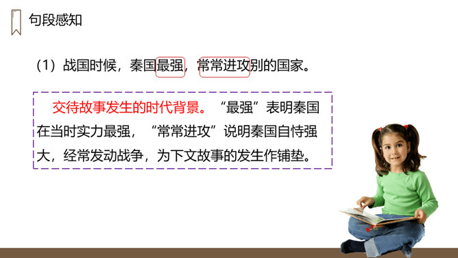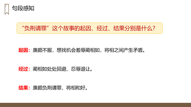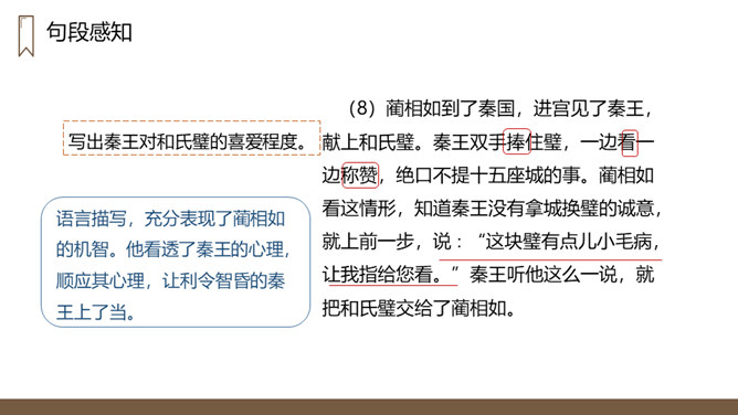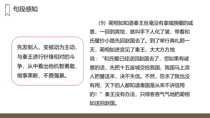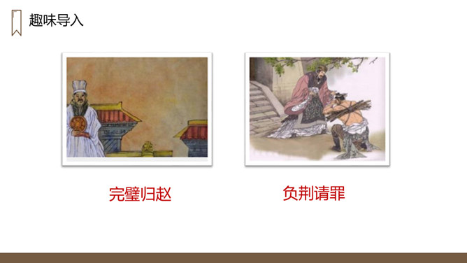 “完璧归赵”这个故事的起因、经过、结果分别是什么?起因:赵王得“和氏璧”,秦王垂涎,设骗局,以城换璧。经过:蔺相如临危受命,见秦王没有诚意,用计骗回和氏璧。然后派人将和氏璧送回赵国,并说服了秦王。结果:完璧归赵,蔺相如被赵王封为上大夫。交待故事发生的时代背景。“最强”表明秦国在当时实力最强,“常常进攻”说明秦国自恃强大,经常发动战争,为下文故事的发生作铺垫。