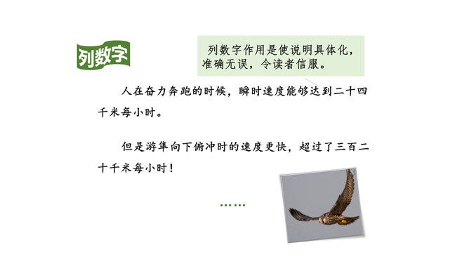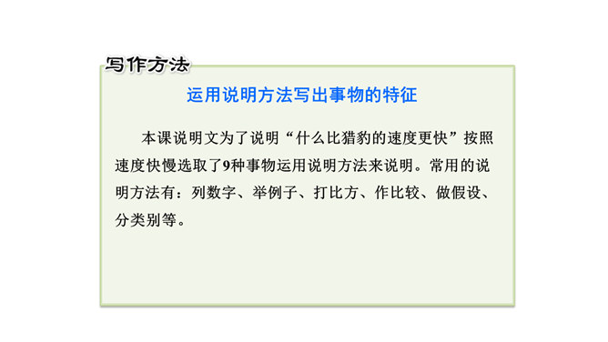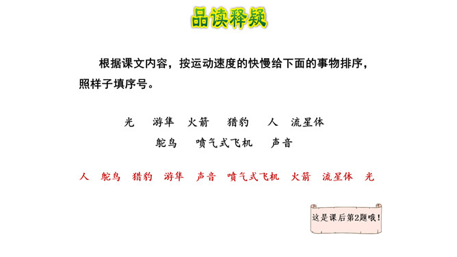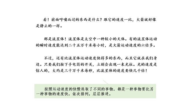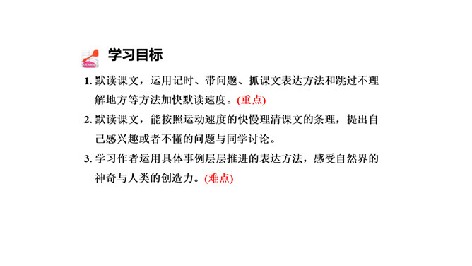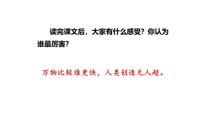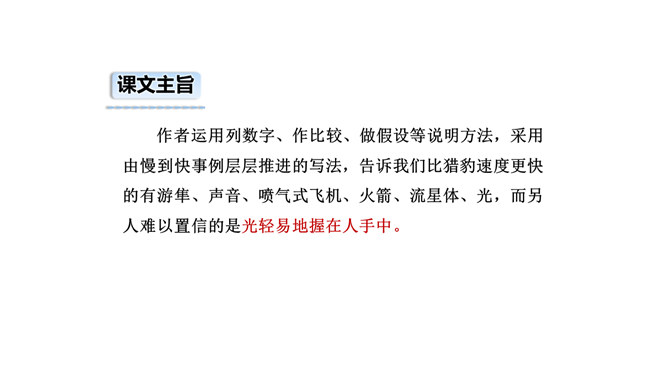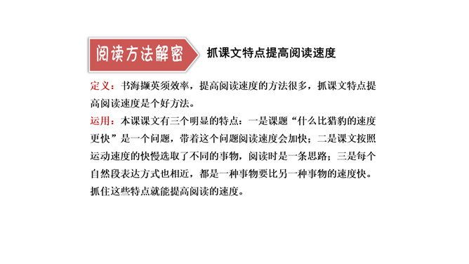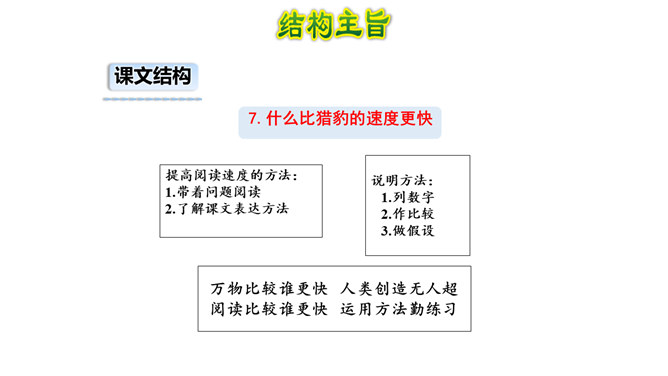 1. 默读课文,运用记时、带问题、抓课文表达方法和跳过不理解地方等方法加快默读速度。(重点)2. 默读课文,能按照运动速度的快慢理清课文的条理,提出自己感兴趣或者不懂的问题与同学讨论。3. 学习作者运用具体事例层层推进的表达方法,感受自然界的神奇与人类的创造力。(难点)按照运动速度的快慢选取了不同的事物,都是一种事物要比另一种事物的速度快,依次排列,层层推进。所属专题:什么比猎豹的速度更快ppt。