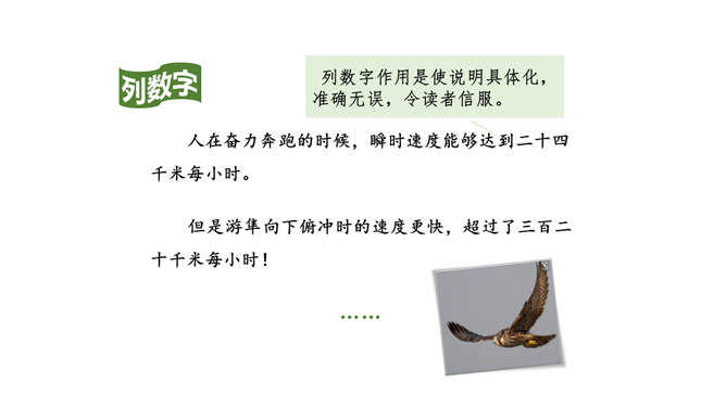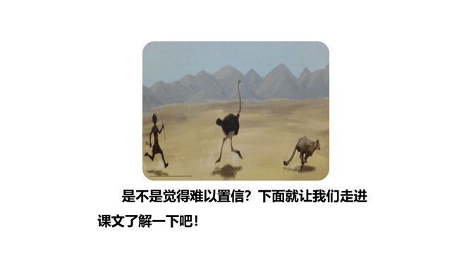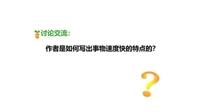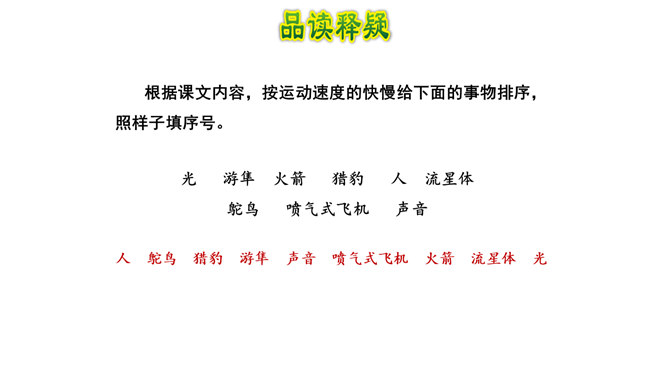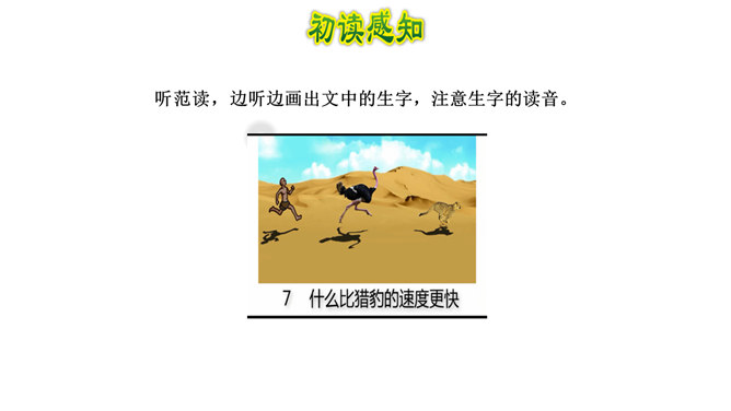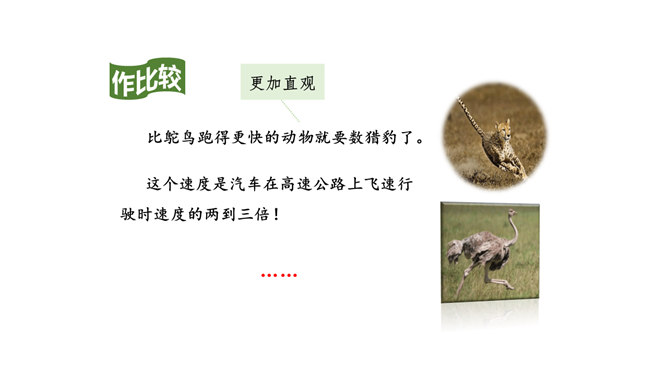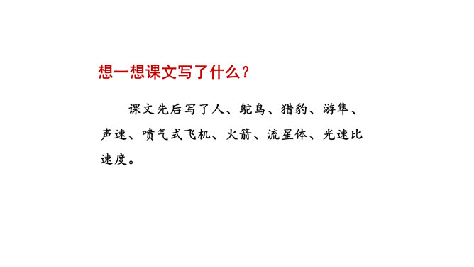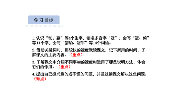 1.认识“鸵、赢”等4个生字,读准多音字“冠”,会写“冠、俯”等11个字,会写“猎豹、冠军”等14个词语。2.借助关键词句,用较快的速度默读课文,记下所用的时间,了解课文的主要内容。(重点)3.了解课文中介绍不同事物的速度时运用了哪些说明方法,体会它们的作用。(重点)4.提出自己感兴趣的或不懂的问题,并通过读课文解决这些问题。(难点)我们身边的交通工具也不停地变换,请你通过查阅资料,然后将你认为最理想的交通工具画下来,或者用一段话写下来。所属专题:什么比猎豹的速度更快ppt。