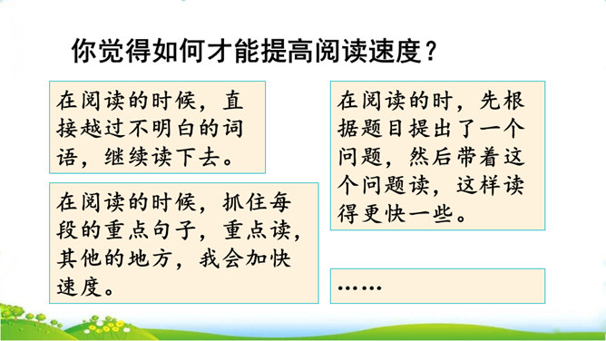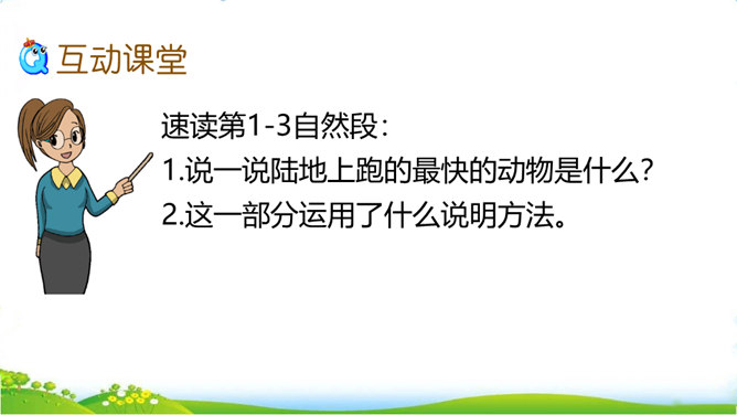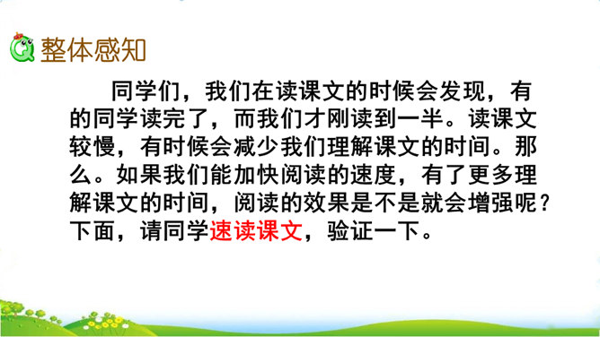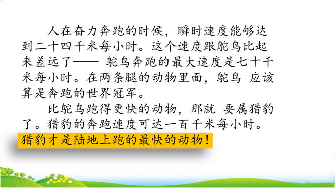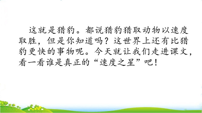这就是猎豹。都说猎豹猎取动物以速度取胜,但是你知道吗?这世界上还有比猎豹更快的事物呢。今天就让我们走进课文,看一看谁是真正的“速度之星”吧!同学们,我们在读课文的时候会发现,有的同学读完了,而我们才刚读到一半。读课文较慢,有时候会减少我们理解课文的时间。那么。如果我们能加快阅读的速度,有了更多理解课文的时间,阅读的效果是不是就会增强呢?下面,请同学速读课文,验证一下。所属专题:什么比猎豹的速度更快ppt。
