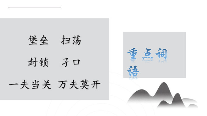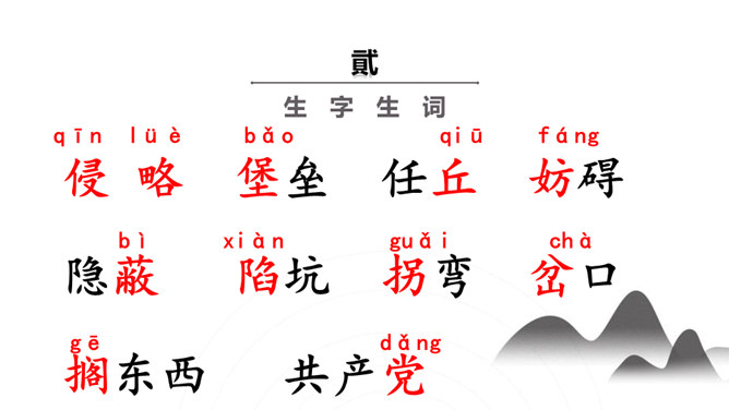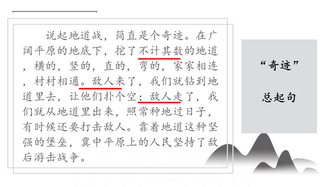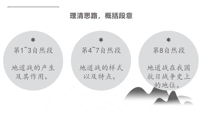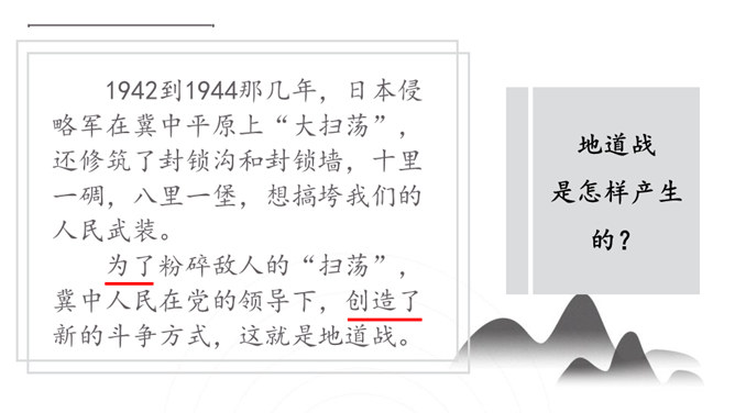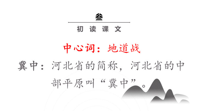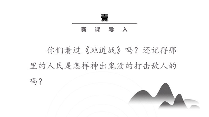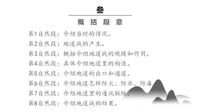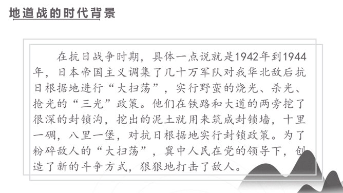 你们看过《地道战》吗?还记得那里的人民是怎样神出鬼没的打击敌人的吗?通过课题,我们知道些什么?第1自然段:介绍当时的情况。第2自然段:地道战的产生。第3自然段:概括介绍地道战的规模和作用。第4自然段:具体介绍地道里的构造。第5自然段:介绍地道的出口和通道。第6自然段:介绍地道怎样防火、防水、防毒。第7自然段:介绍地道里的通讯联络。第8自然段:介绍地道战的结果。所属专题:冀中的地道战ppt。