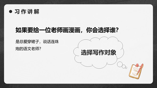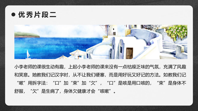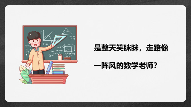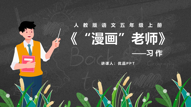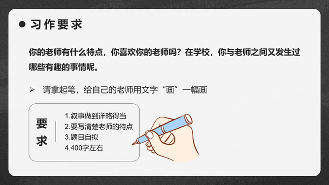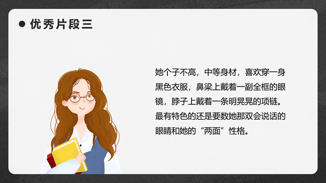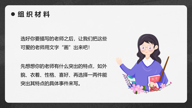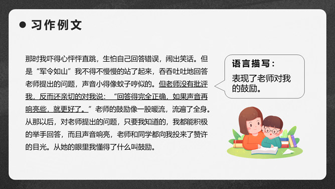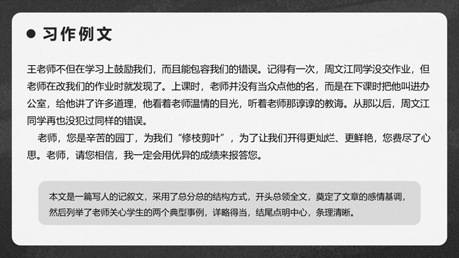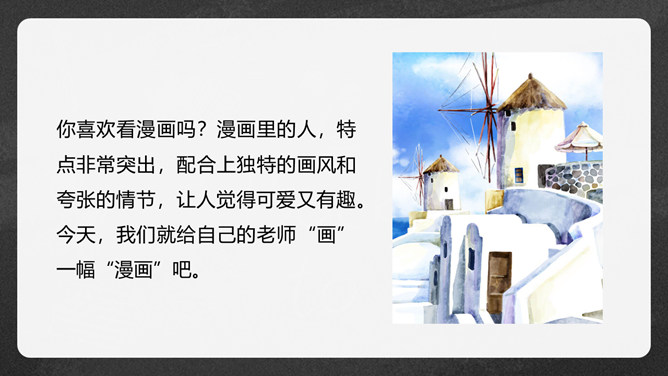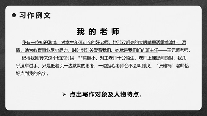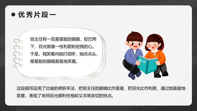 这段描写运用了比喻的修辞手法,把班主任的眼睛比作星星,把目光比作利箭,通过她盈盈地笑着,表现了老师目光犀利性格却又非常亲切的特点。本文是一篇写人的记叙文,采用了总分总的结构方式,开头总领全文,奠定了文章的感情基调,然后列举了老师关心学生的两个典型事例,详略得当,结尾点明中心,条理清晰。选好你要描写的老师之后,让我们把这些可爱的老师用文字“画”出来吧!所属专题:漫画老师ppt。