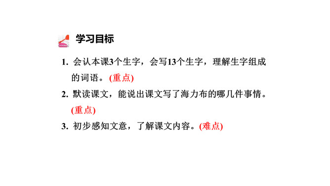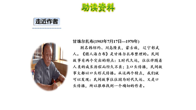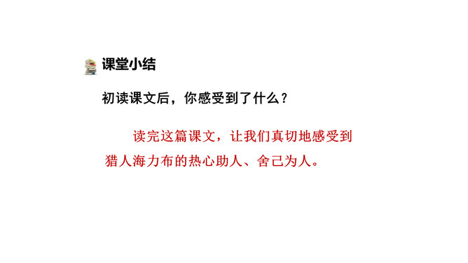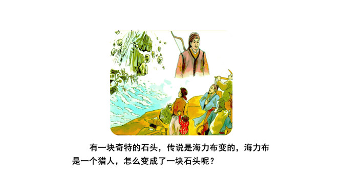 有一块奇特的石头,传说是海力布变的,海力布是一个猎人,怎么变成了一块石头呢?会认本课3个生字,会写13个生字,理解生字组成的词语。默读课文,能说出课文写了海力布的哪几件事情。初步感知文意,了解课文内容。本文讲的是猎人海力布打猎时救了龙王的女儿,得到一块宝石,使他听得懂动物的语言,他把利用宝石听到了大山要崩塌、洪水要淹没村子的可怕消息告诉了乡亲们,乡亲们得救了,而他自己却变成了石头。所属专题:猎人海力布ppt。