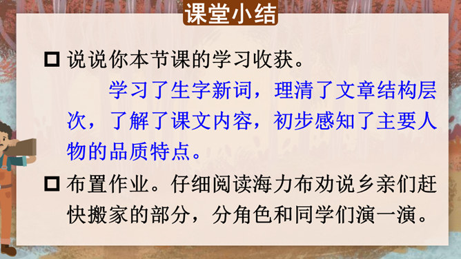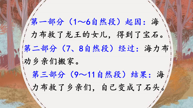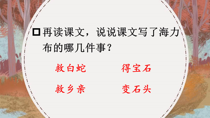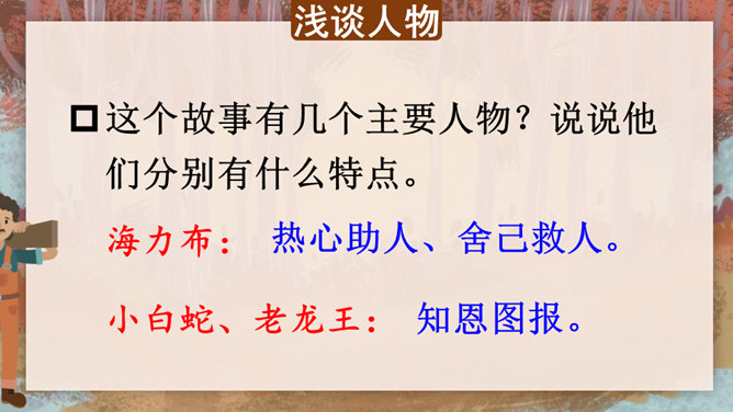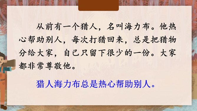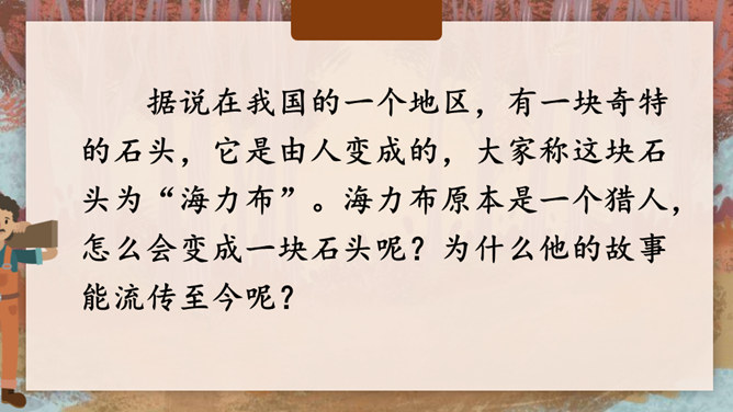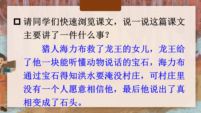 据说在我国的一个地区,有一块奇特的石头,它是由人变成的,大家称这块石头为“海力布”。海力布原本是一个猎人,怎么会变成一块石头呢?为什么他的故事能流传至今呢?请同学们快速浏览课文,说一说这篇课文主要讲了一件什么事?猎人海力布救了龙王的女儿,龙王给了他一块能听懂动物说话的宝石,海力布通过宝石得知洪水要淹没村庄,可村庄里没有一个人愿意相信他,最后他说出了真相变成了石头。所属专题:猎人海力布ppt。