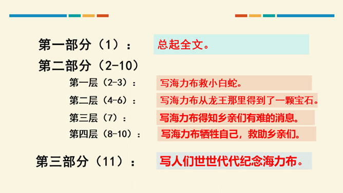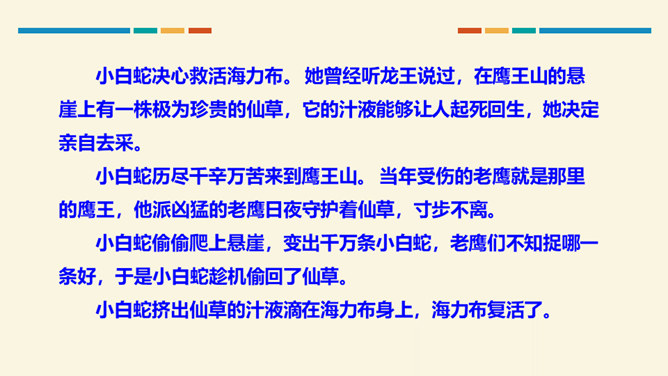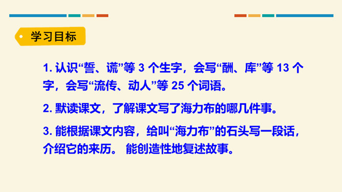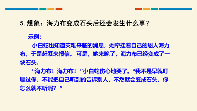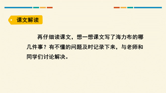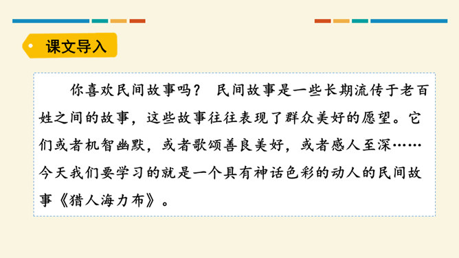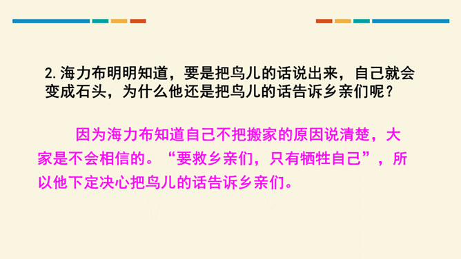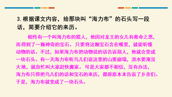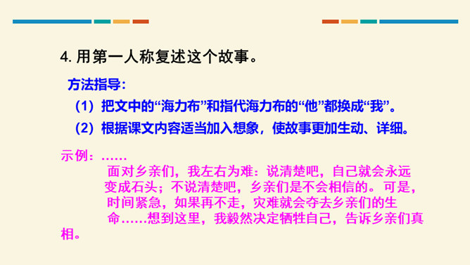 海力布明明知道,要是把鸟儿的话说出来,自己就会变成石头,为什么他还是把鸟儿的话告诉乡亲们呢?因为海力布知道自己不把搬家的原因说清楚,大家是不会相信的。“要救乡亲们,只有牺牲自己”,所以他下定决心把鸟儿的话告诉乡亲们。创造性复述要求我们,要根据课文内容,展开合理想象,充实内容。同样的事件从不同的角度看就可能呈现出不同的面貌,在不同的人看来也会有不同的意义。 换一种人称来讲是一种不错的方法。所属专题:猎人海力布ppt。