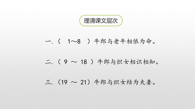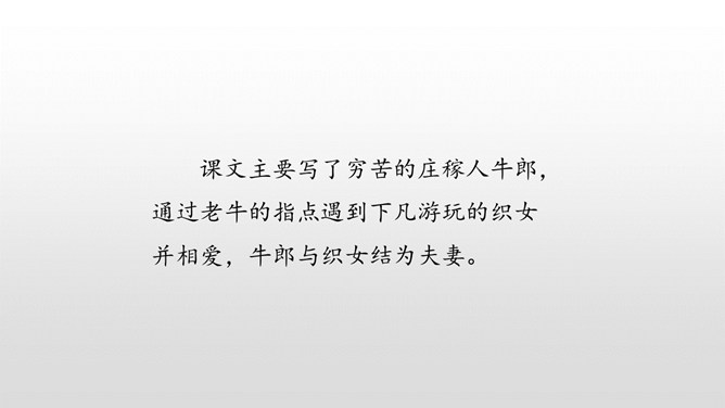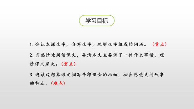 1.会认本课生字,会写生字,理解生字组成的词语。 (重点)2.有感情地朗读课文,弄清本文主要讲了一件什么事情,理清课文层次。(重点)3.边读边想象课文描写牛郎织女的画面,初步感受民间故事的特点。(难点)1.默读课文,读准字音,读通句子,并划出生字新词。2.结合上下文或借助工具书理解生词意思。3.思考课文主要讲了什么内容。有感情地朗读课文比赛,注意读准字音。开火车分小组朗读课文。男女生竞赛朗读课文。所属专题:牛郎织女ppt。