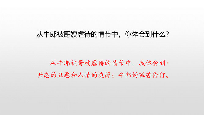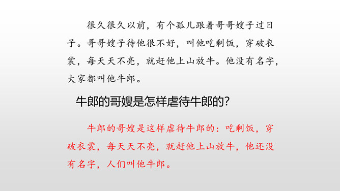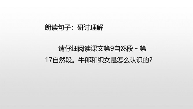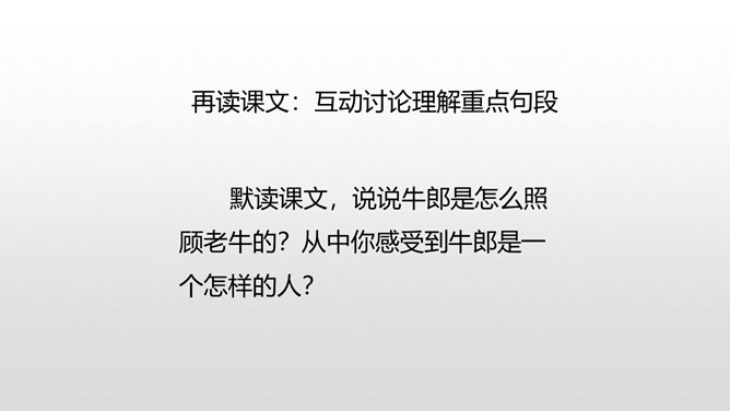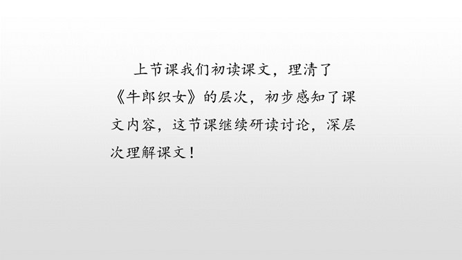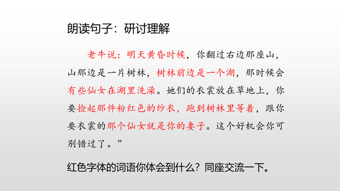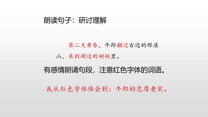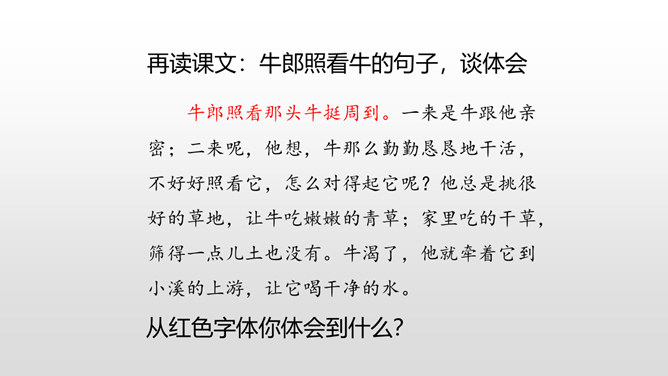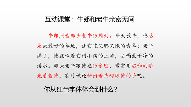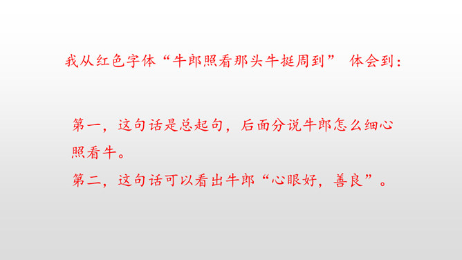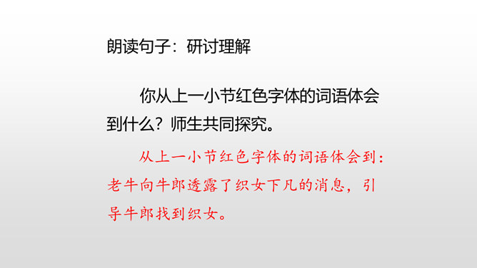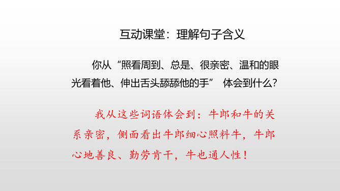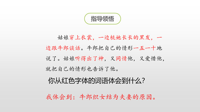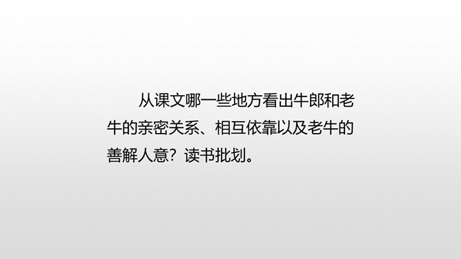 上节课我们初读课文,理清了《牛郎织女》的层次,初步感知了课文内容,这节课继续研读讨论,深层次理解课文!再读课文:互动讨论理解重点句段。默读课文,说说牛郎是怎么照顾老牛的?从中你感受到牛郎是一个怎样的人?我从红色字体“牛郎照看那头牛挺周到” 体会到:第一,这句话是总起句,后面分说牛郎怎么细心照看牛。第二,这句话可以看出牛郎“心眼好,善良”。从课文哪一些地方看出牛郎和老牛的亲密关系、相互依靠以及老牛的善解人意?读书批划。所属专题:牛郎织女ppt。