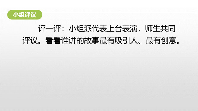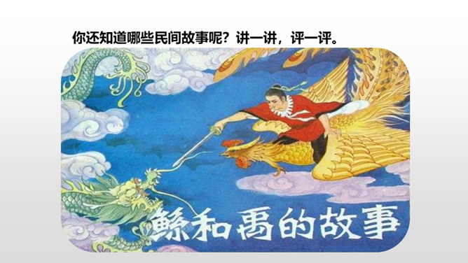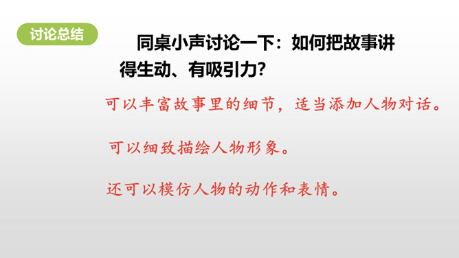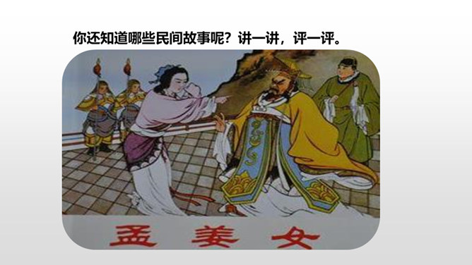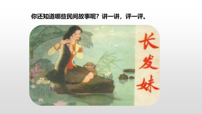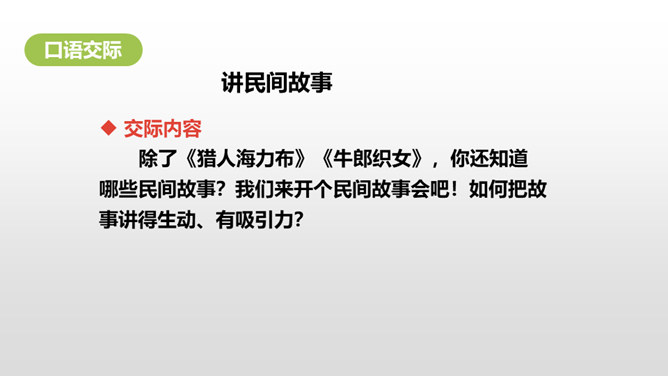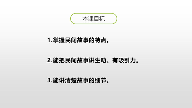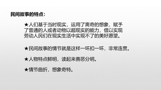 1.掌握民间故事的特点。2.能把民间故事讲生动、有吸引力。3.能讲清楚故事的细节。民间故事的特点:人们基于当时现实,运用了离奇的想象,赋予了普通的人或者动物以超现实的能力,借以实现劳动人民们在现实生活中实现不了的美好愿望。民间故事的情节就是这样一环扣一环,非常连贯。人物特点鲜明,读起来善恶分明。情节曲折,想象奇特。同桌小声讨论一下:如何把故事讲得生动、有吸引力?所属专题:讲民间故事ppt。