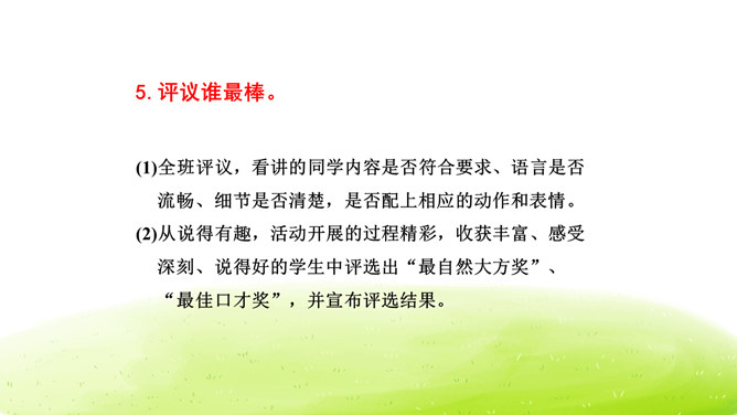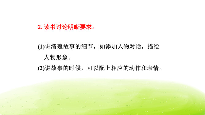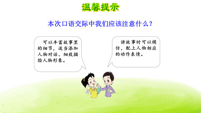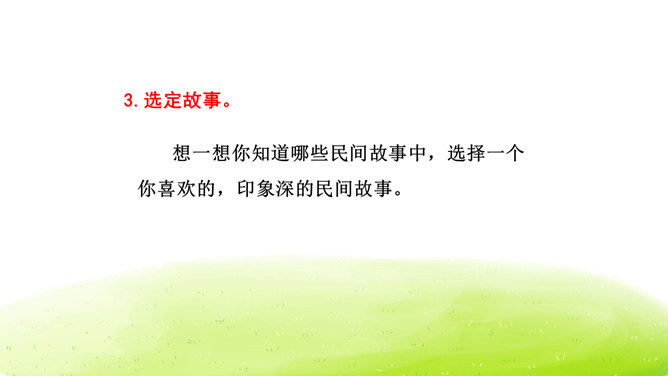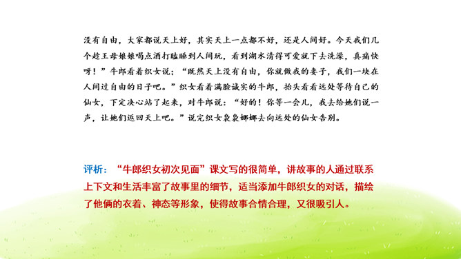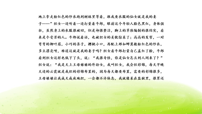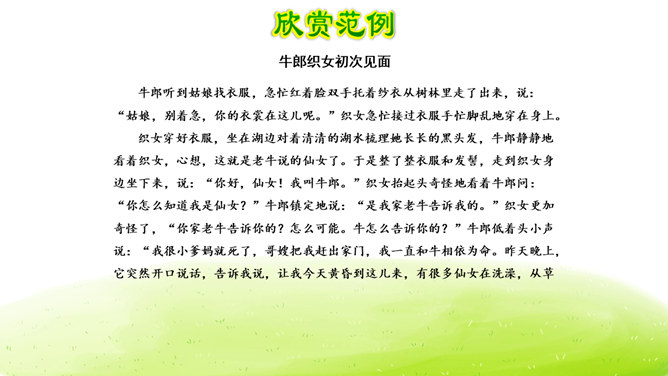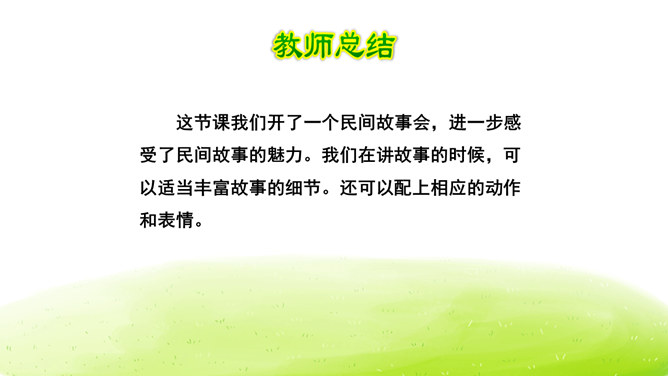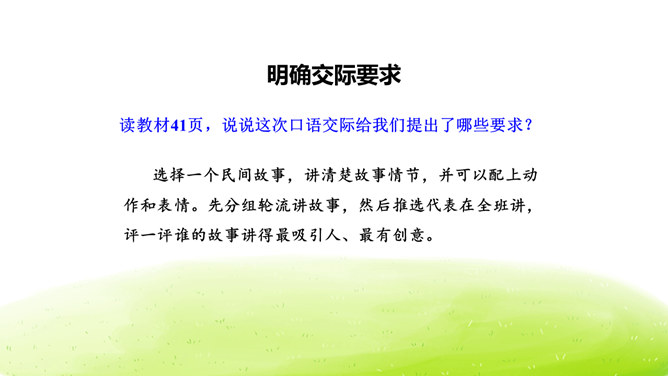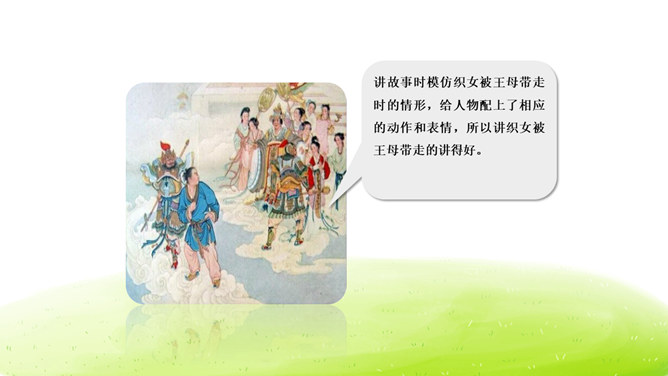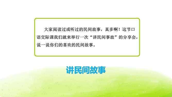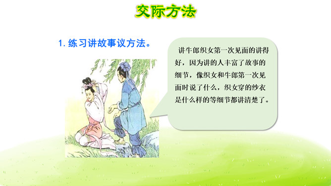 大家阅读过或听过的民间故事,真多啊!这节口语交际课我们就来举行一次“讲民间事故”的分享会,说一说你们的喜欢的民间故事。本次口语交际中我们应该注意什么?可以丰富故事里的细节,适当添加人物对话、细致描绘人物形象。讲故事时可以模仿,配上人物相应的动作表情。讲牛郎织女第一次见面的讲得好,因为讲的人丰富了故事的细节,像织女和牛郎第一次见面时说了什么,织女穿的纱衣是什么样的等细节都讲清楚了。所属专题:讲民间故事ppt。
